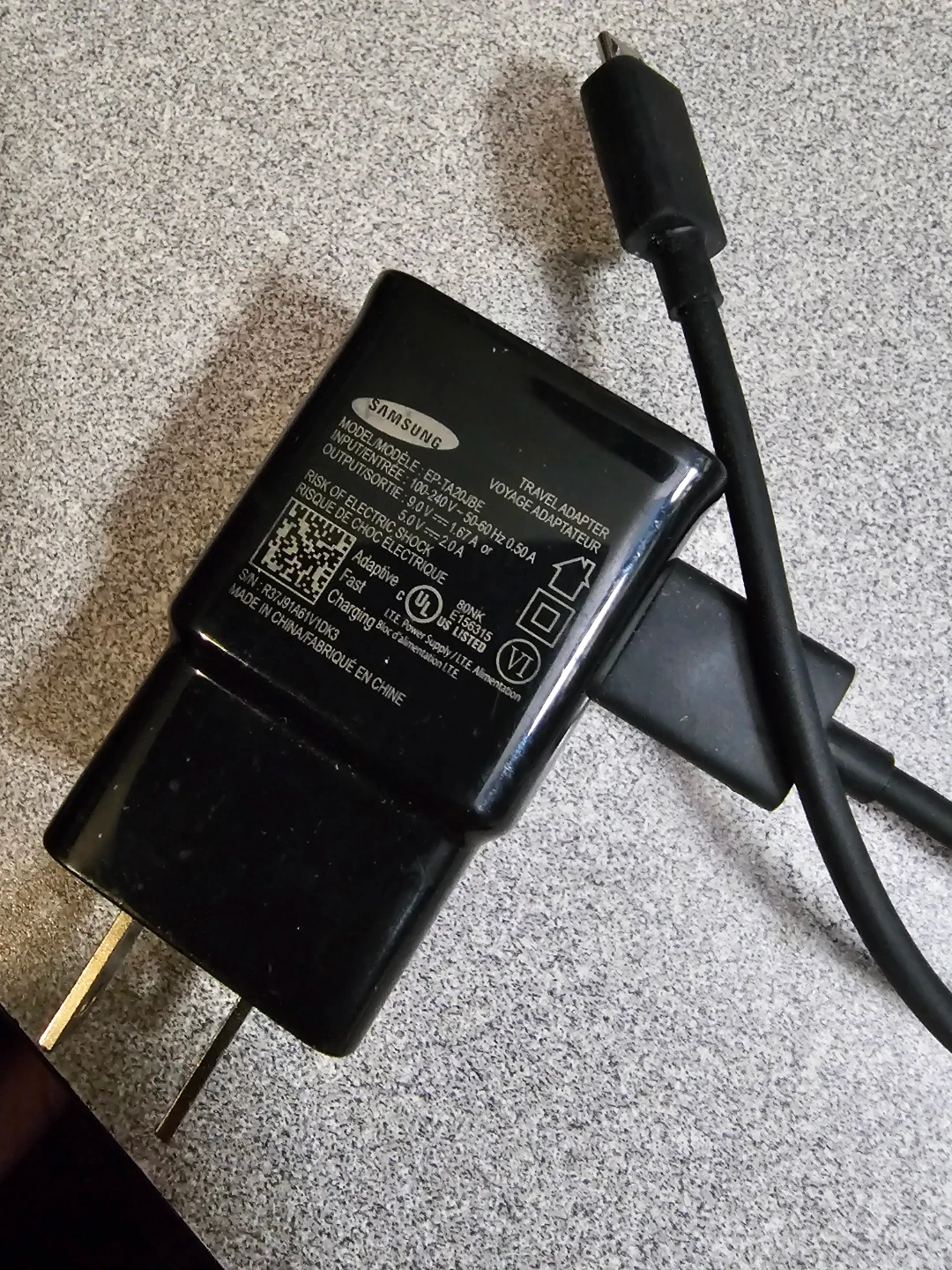 This is a black Samsung travel adapter with a USB cable. It's a charging adapter for electronic devices. The adapter has an output of 5.0V - 2.0A.