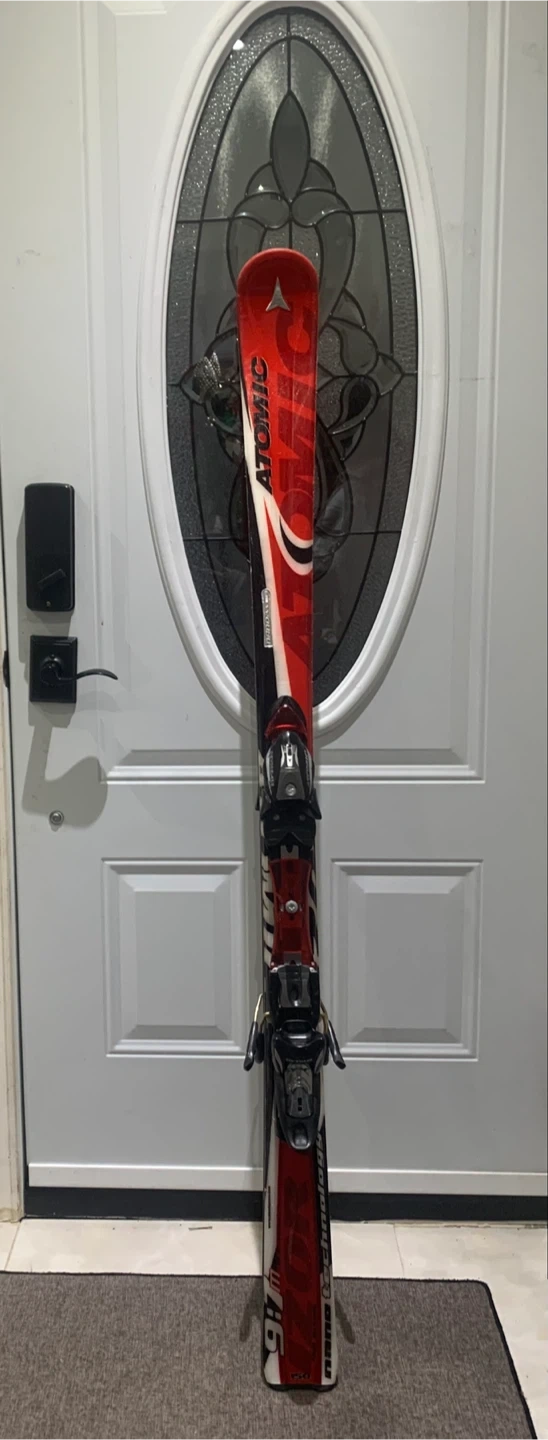 Selling a pair of Atomic skis in red and white. They are in good condition and ready for the slopes! The skis feature Atomic branding and are perfect for winter fun