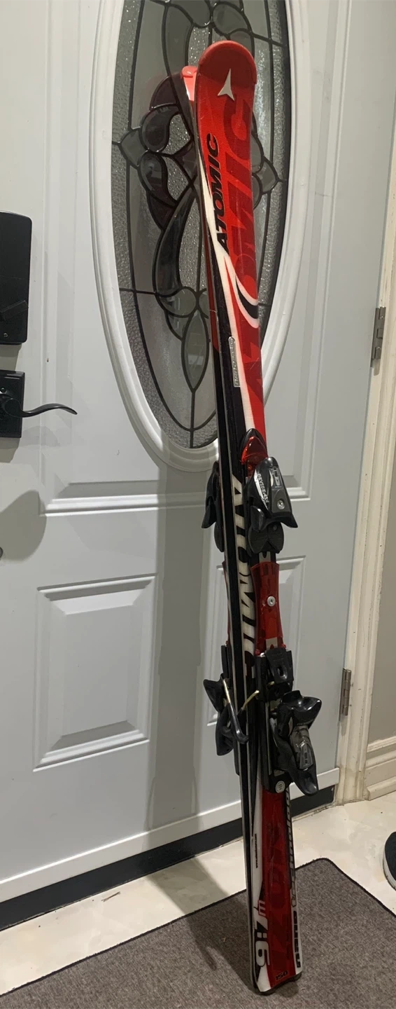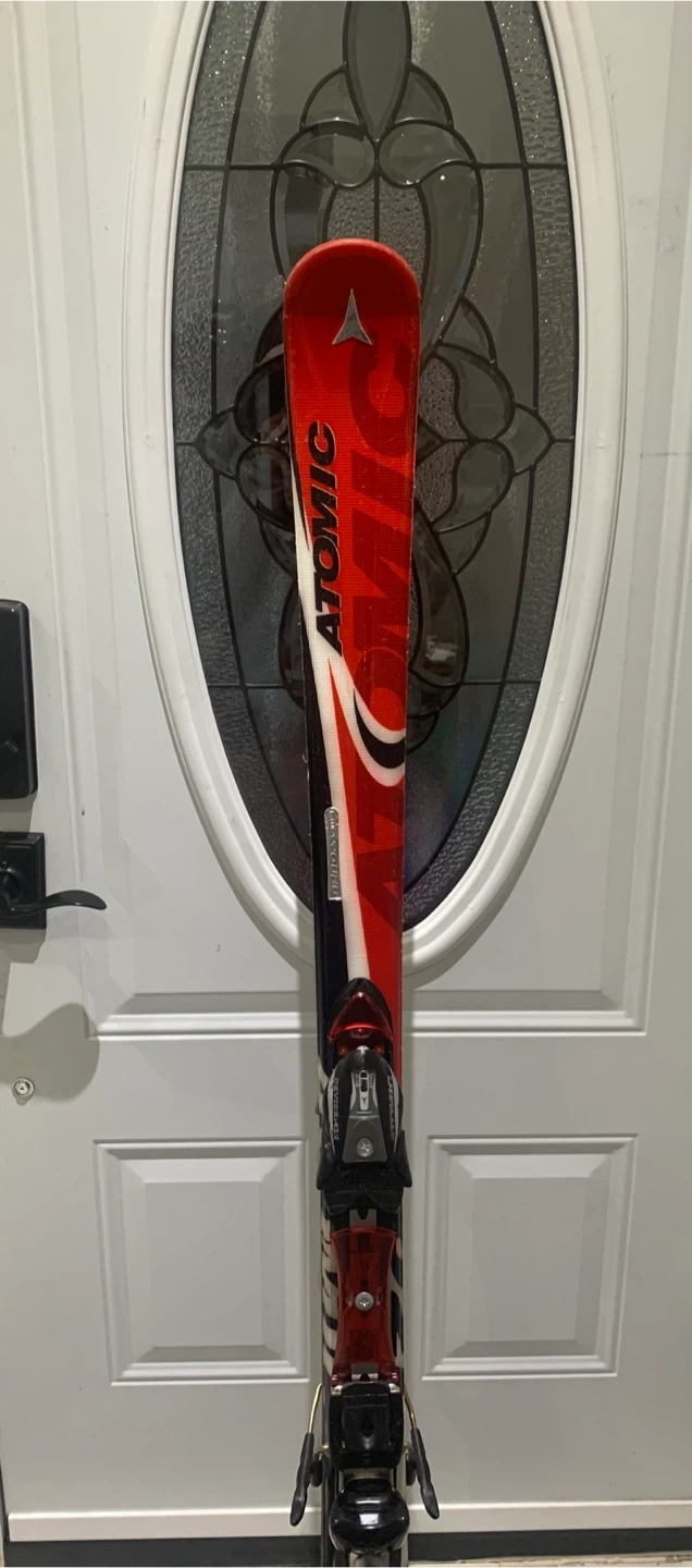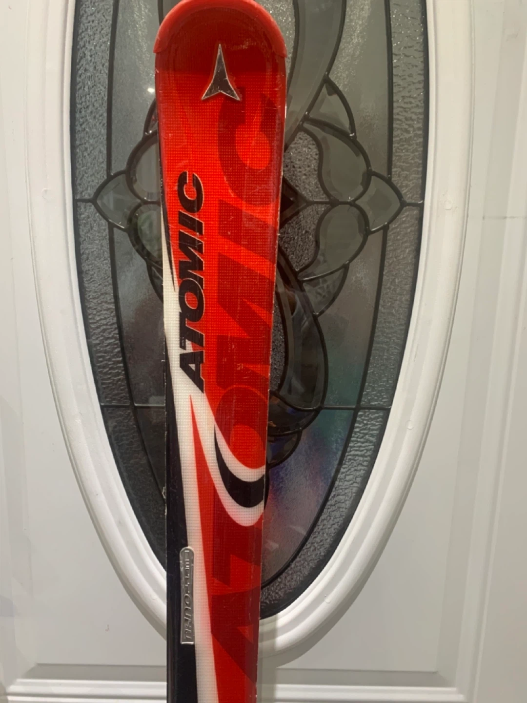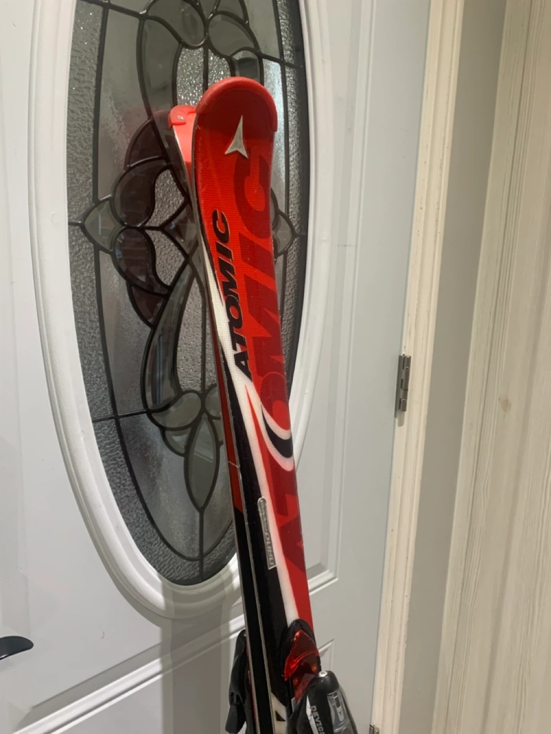 Selling a pair of Atomic skis in red and white. They are in good condition and ready for the slopes! The skis feature Atomic branding and are perfect for winter fun
