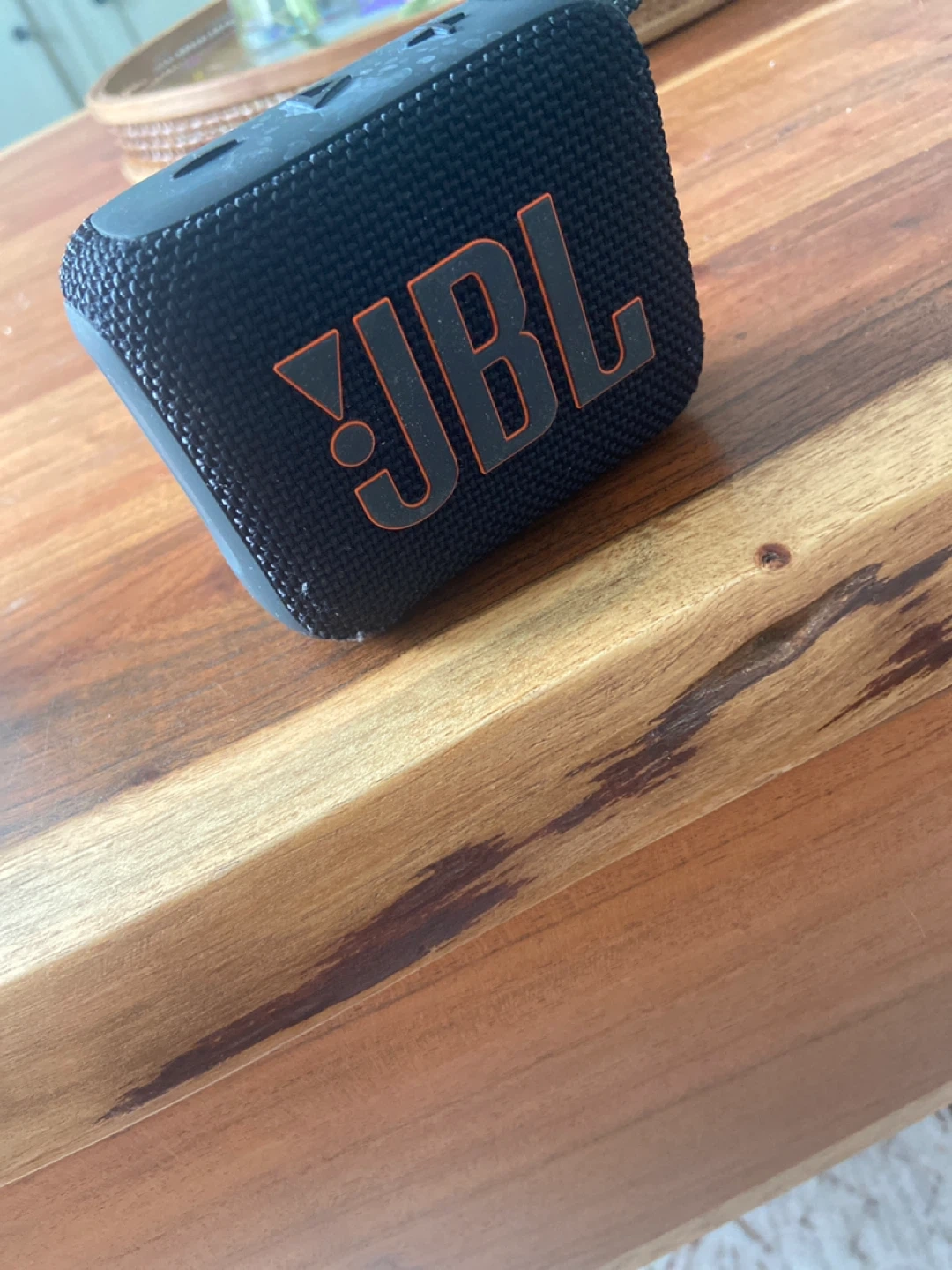 This is a black JBL Go 3 portable speaker with orange accents. It's waterproof and dustproof, making it great for outdoor use. It offers rich sound and a compact design, perfect for taking your tunes anywhere!