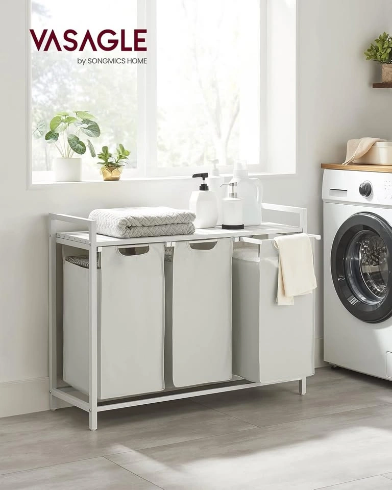 Laundry hamper with a metal frame and 3 pull-out, removable bags. Includes a shelf. Cream white and cloud white. Dimensions: 36.4 x 13 x 28.4 inches. Each bag is approximately 10.6 gallons (40 L).