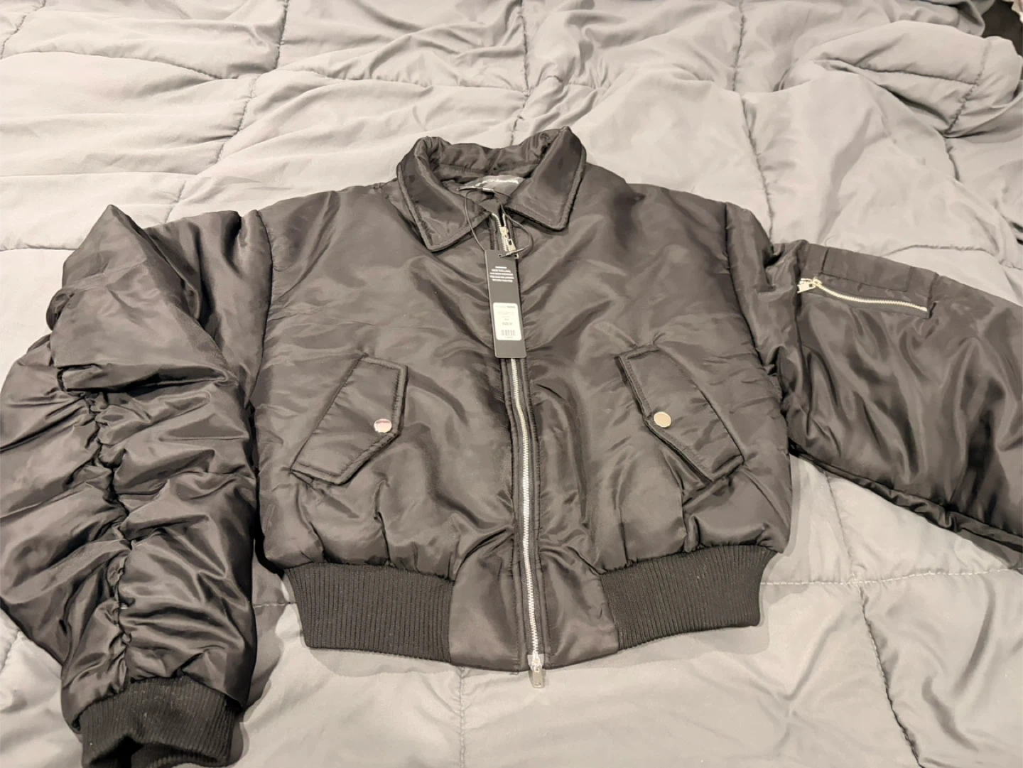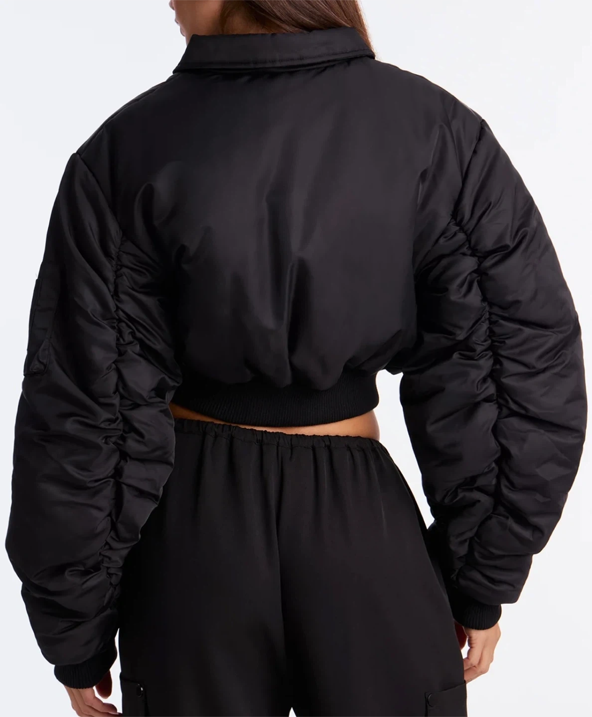 This black cropped bomber jacket features a classic collar and a zip-up front. It's made of a shiny nylon-like material with elasticated cuffs and hem. The sleeves have a unique ruched design, and there are two buttoned flap pockets on the front, plus a zippered pocket on the left sleeve.