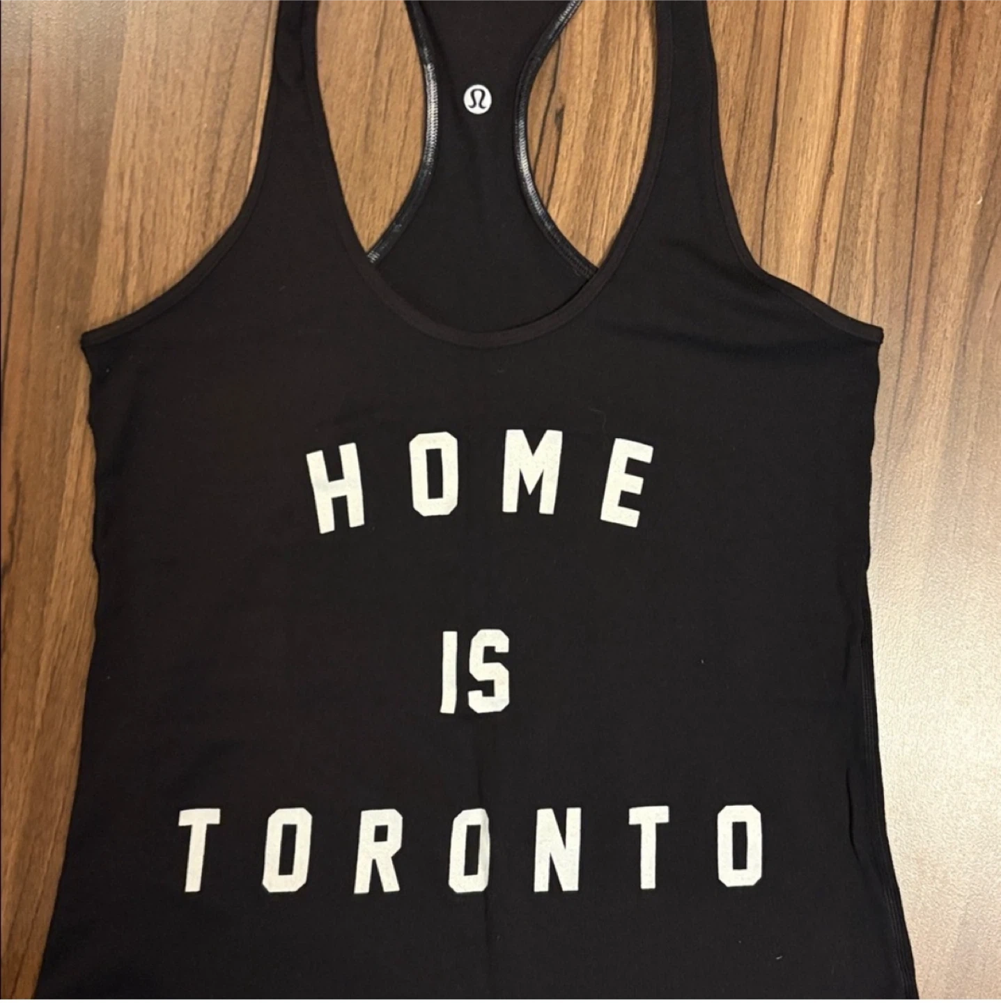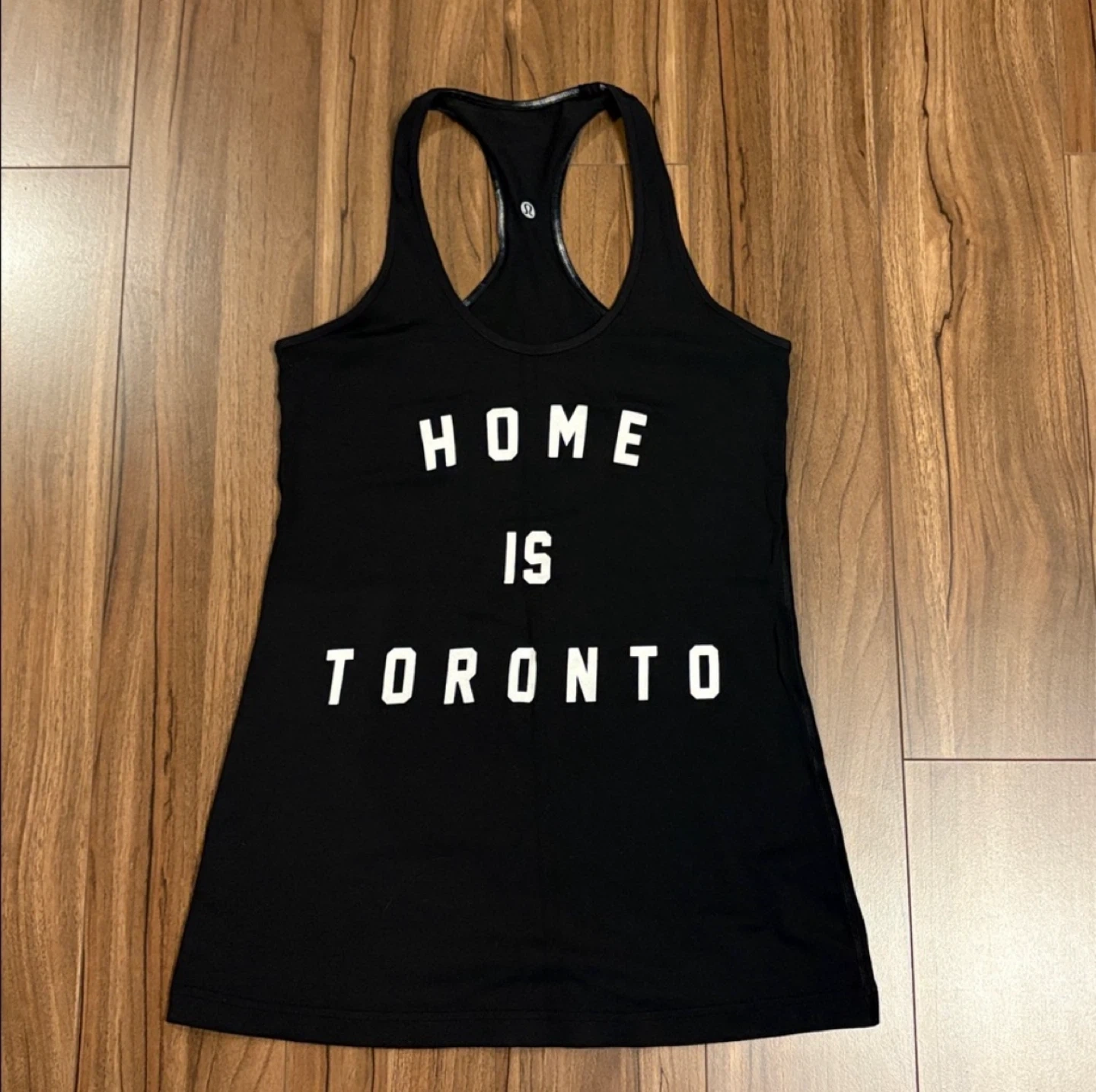 Lululemon X Peace Collective Racerback tank top (limited edition) in black with “Home Is Toronto” in white block letters across front. Fitted style made from standard Lululemon wicking material. Worn a handful of times and in excellent condition. US size medium.