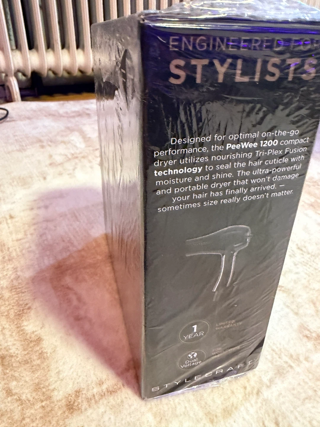 This StyleCraft Pee Wee 1200 is a compact, foldable handle hair dryer. It features Tri-Plex Fusion technology and dual voltage. Two attachments are included, along with a travel/storage bag.