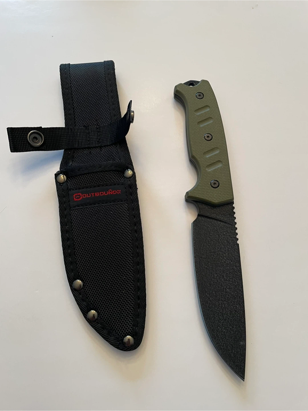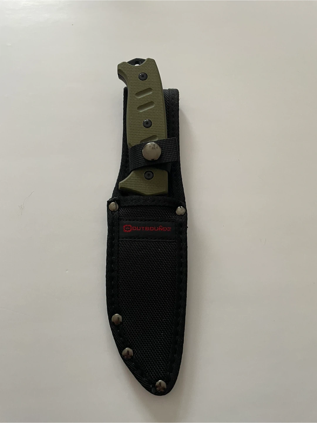 This is an Outbound fixed blade knife with a green handle. It comes with a black nylon sheath for easy carrying and storage. The knife features a durable blade perfect for various outdoor tasks.