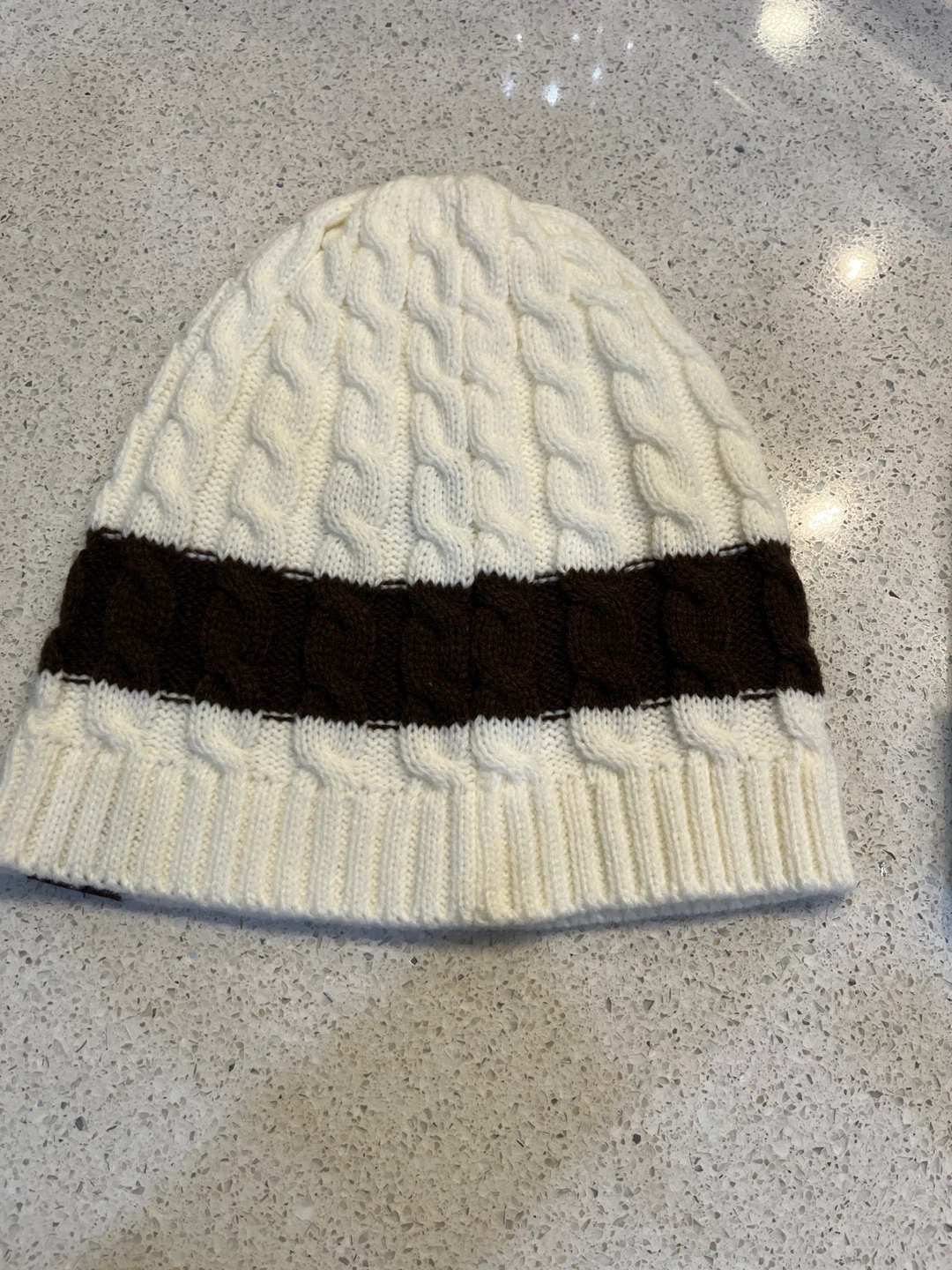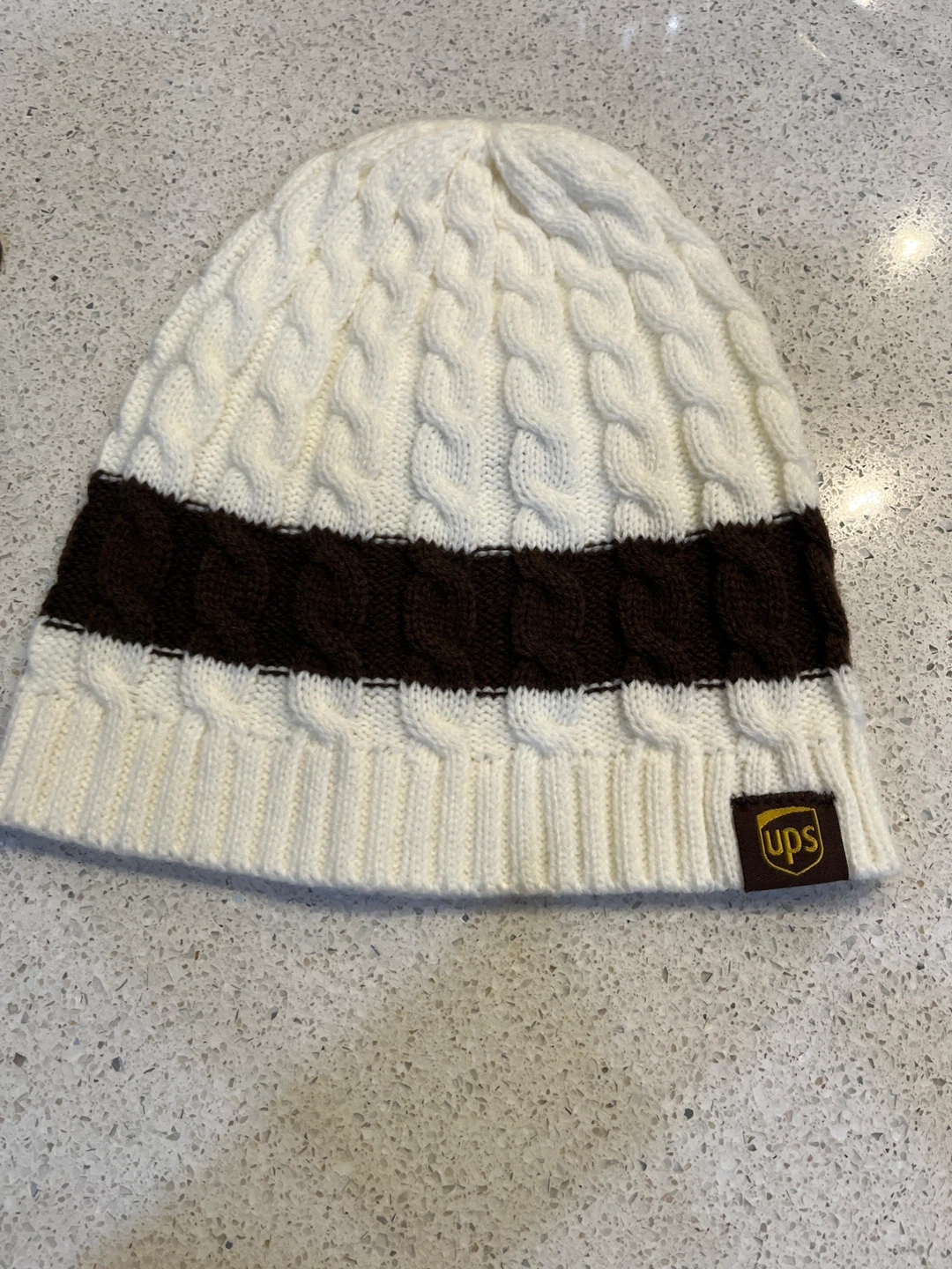 Cream and brown cable knit toque. Features the UPS logo on a faux leather patch. It's a cozy hat for cooler weather.