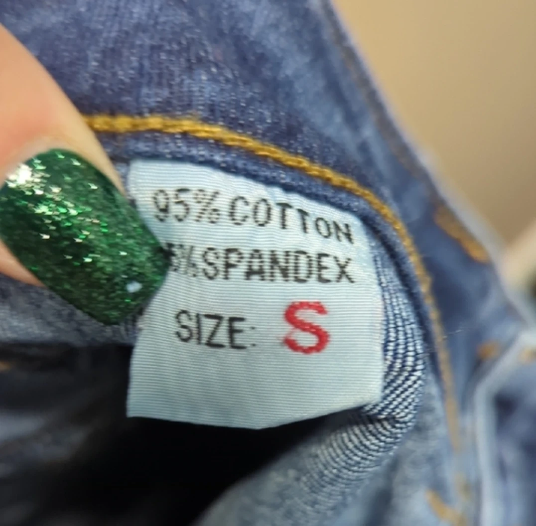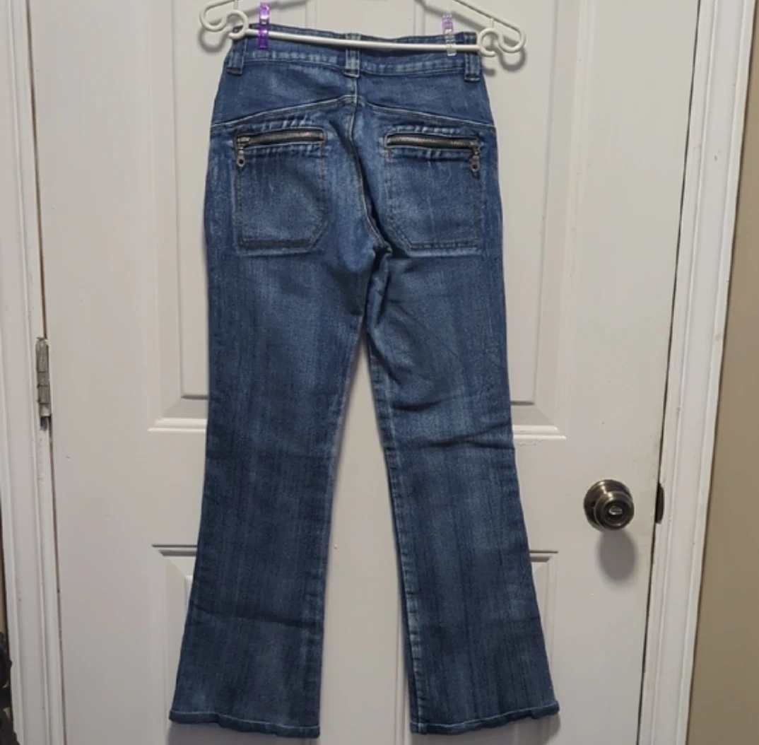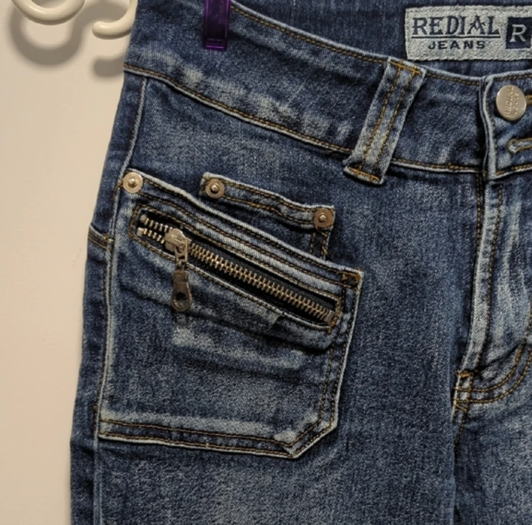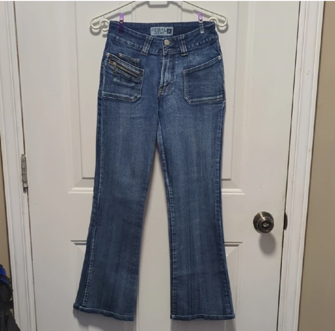 These RED|AL JEANS are a stylish pair of blue denim flare jeans. They feature unique zippered pockets on the front and back for added detail. The denim is a classic wash, perfect for everyday wear.size S