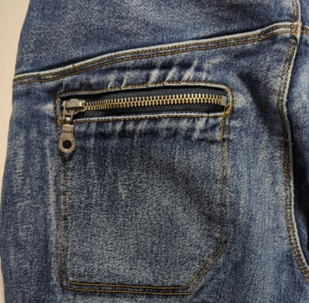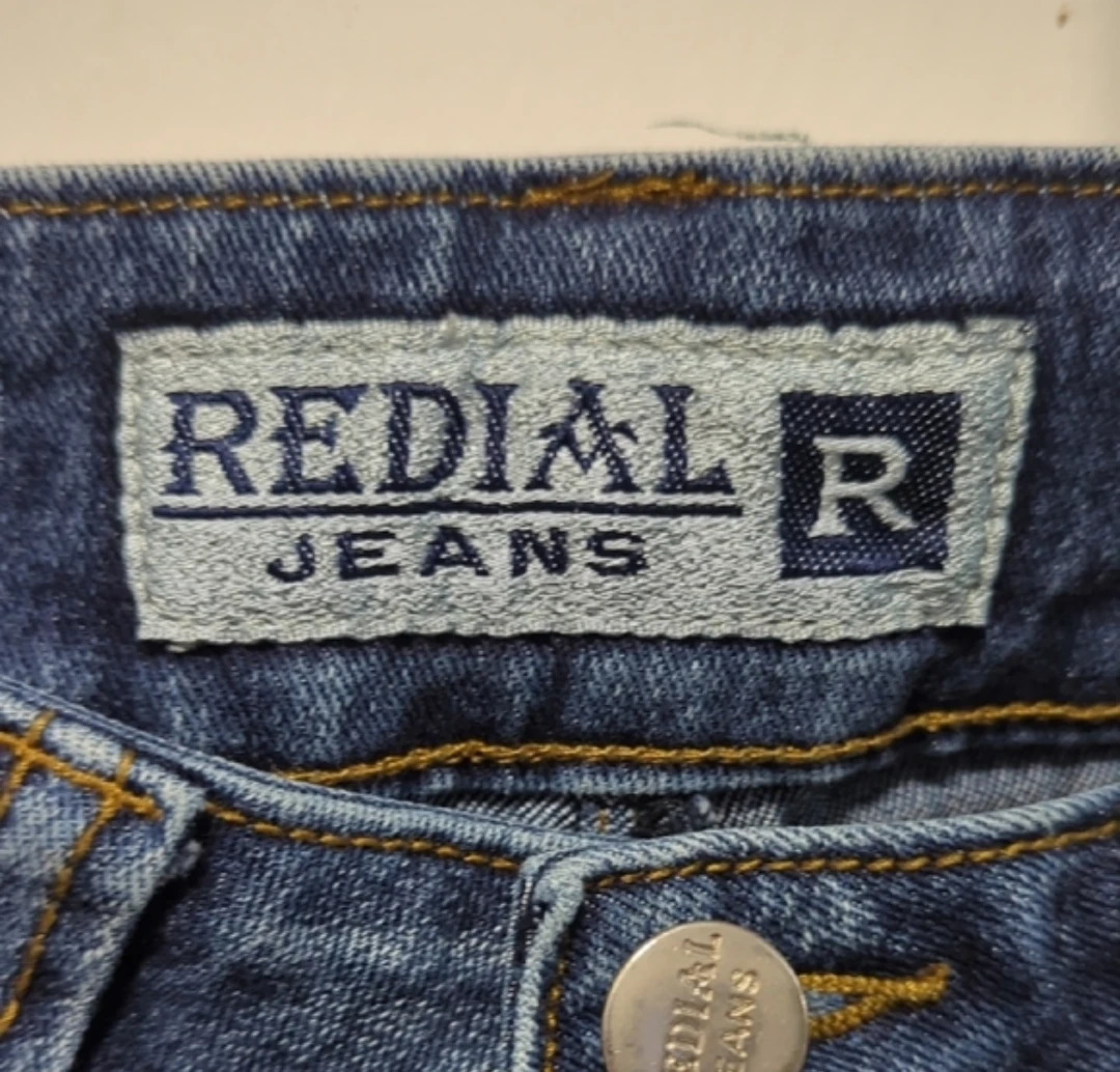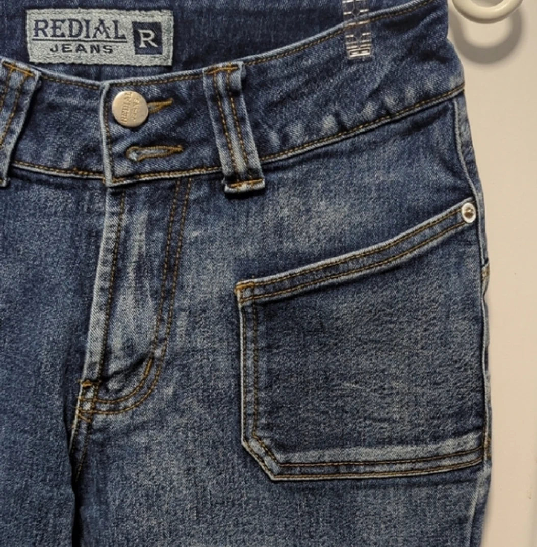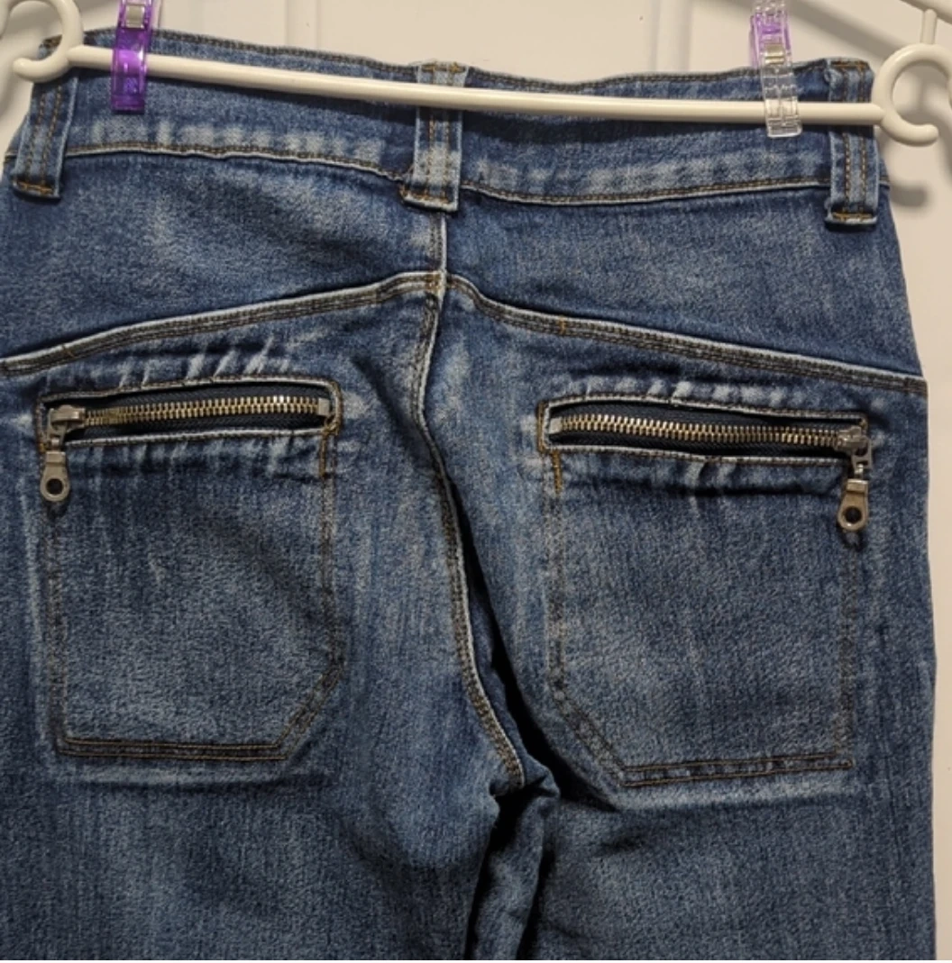 These RED|AL JEANS are a stylish pair of blue denim flare jeans. They feature unique zippered pockets on the front and back for added detail. The denim is a classic wash, perfect for everyday wear.size S