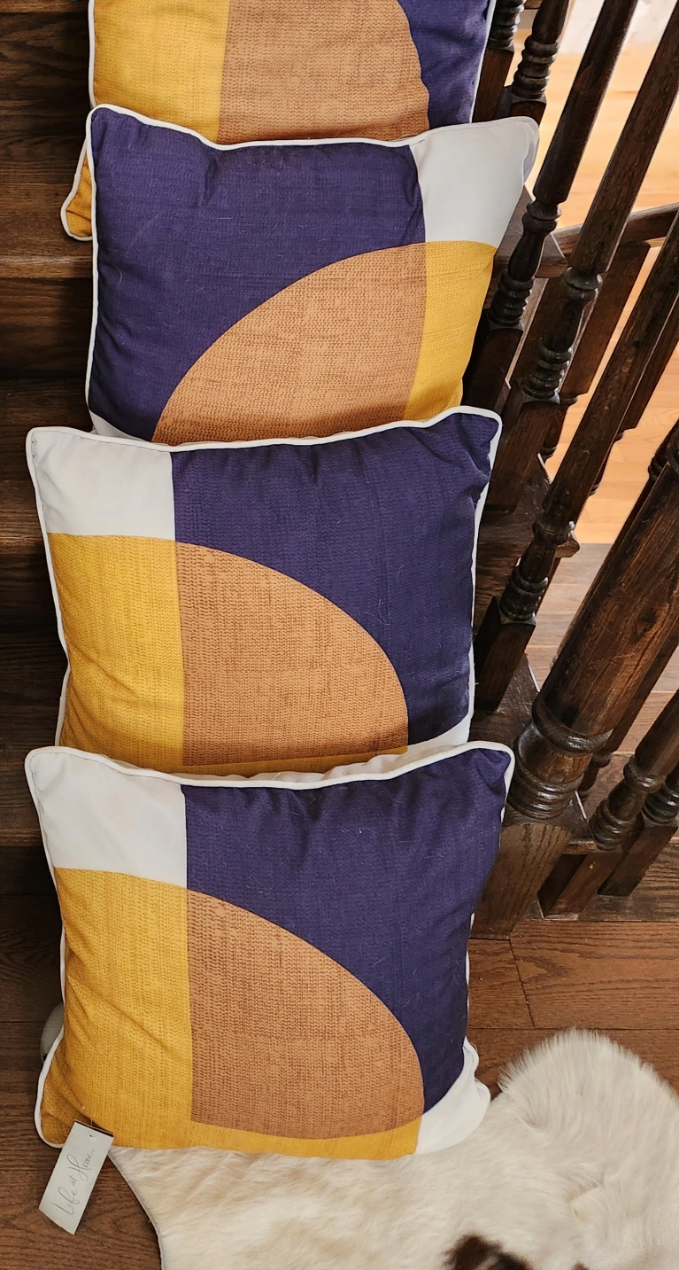 Selling decorative Patio pillows from Life at Home. These pillows feature a modern geometric design with sections in mustard yellow, tan, and navy blue. They're in great condition and ready to add a pop of colour to your outdoor space! 18x18 water repellent