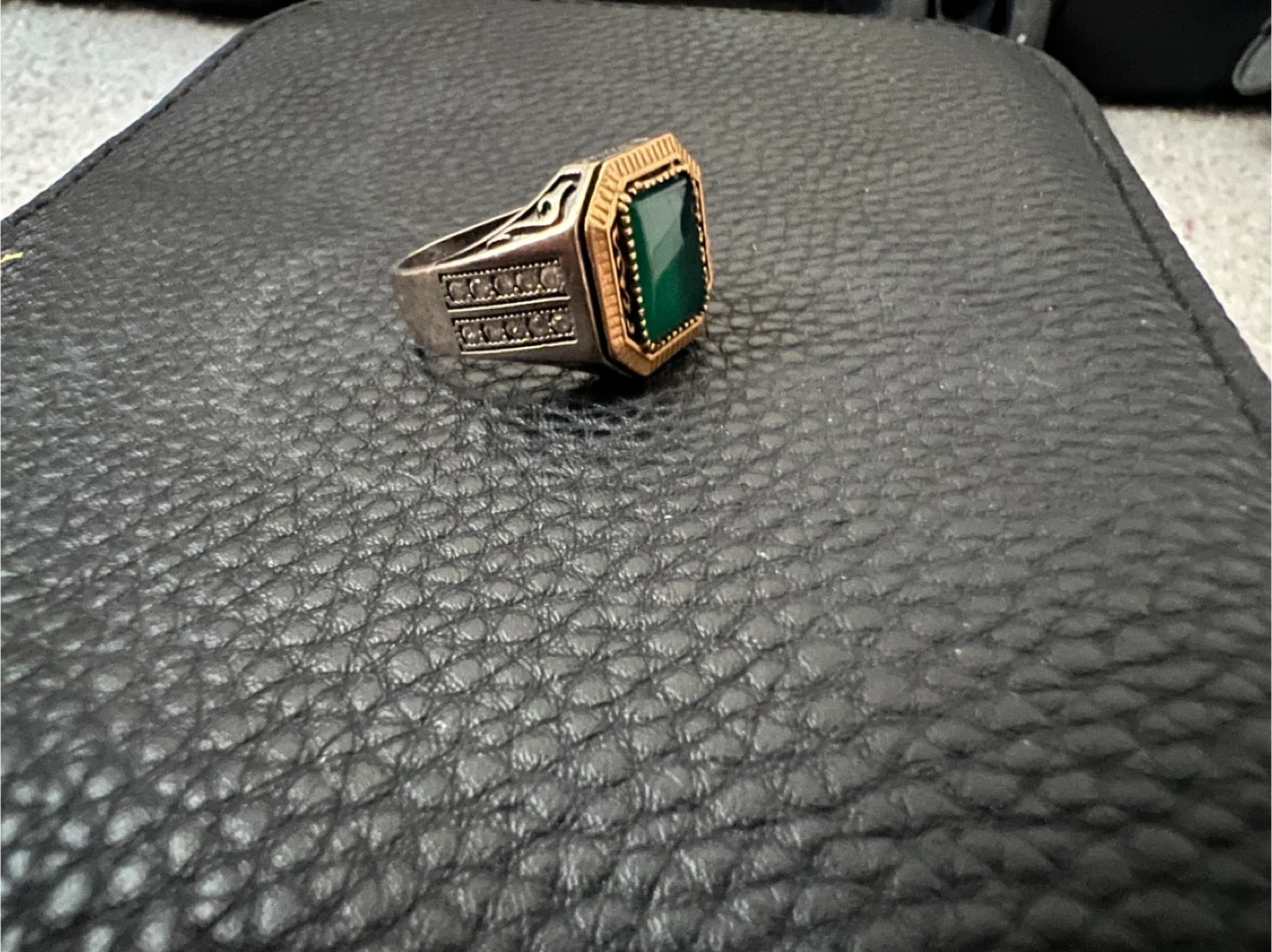 This men's ring features a square-cut green stone. It has a silver band with gold-tone accents and decorative detailing on the sides. A stylish accessory!