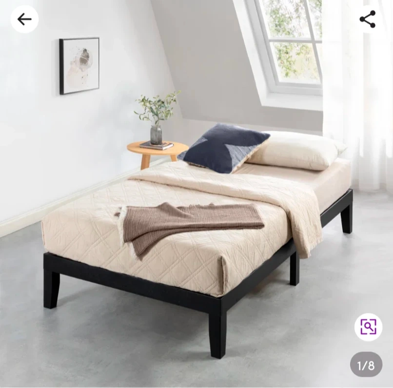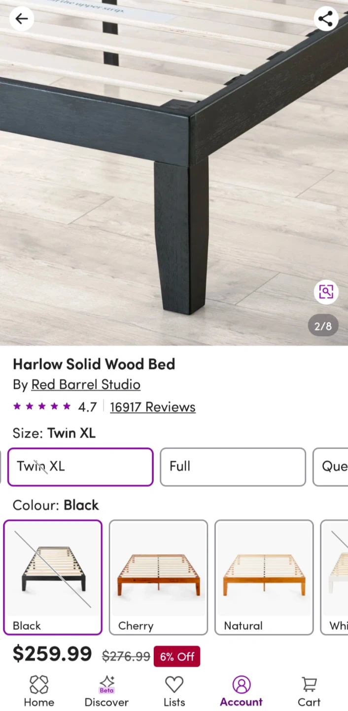 This is a Red Barrel Studio Harlow bed frame in Twin XL size. It's constructed from solid wood with a black finish. The frame includes wooden slats for mattress support.