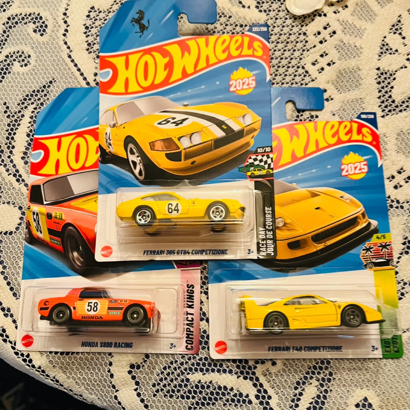 Three Hot Wheels die-cast cars are included: a yellow Ferrari 365 GTB4 Competizione, an orange Honda S800 Racing, and a yellow Ferrari F40 Competizione. These are all 2025 models. Each car is 3+ years recommended.