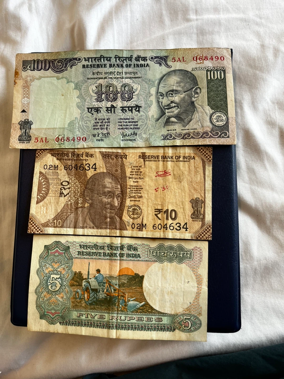 5 dollars each A collection of Indian Rupee banknotes, including denominations of 100, 10, and 5 Rupees from the Reserve Bank of India. These are paper currency notes.