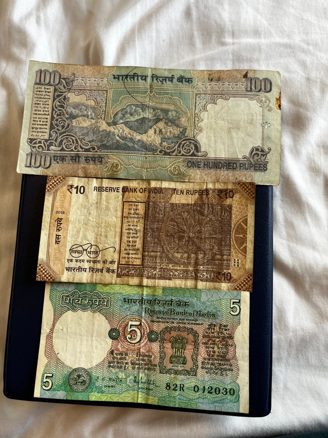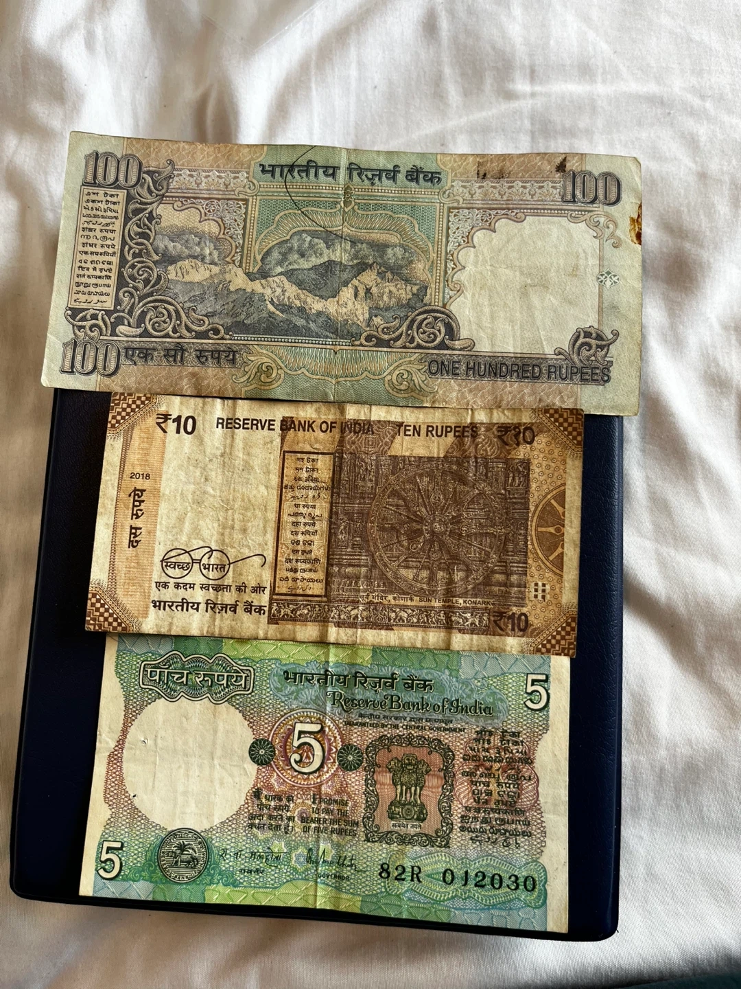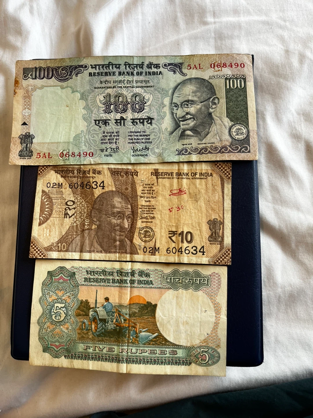 5 dollars each A collection of Indian Rupee banknotes, including denominations of 100, 10, and 5 Rupees from the Reserve Bank of India. These are paper currency notes.