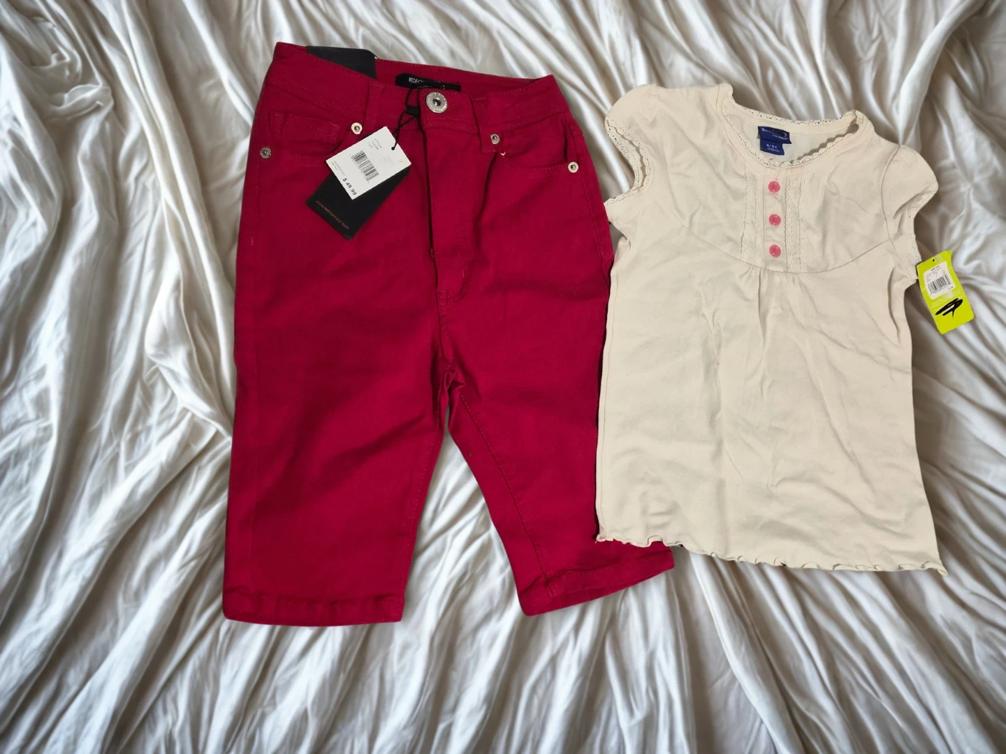 This is a set of 3-4 years girl's red shorts and a cream-coloured short-sleeved top. The top has pink button details and lace trim. Both items are new with tags attached.