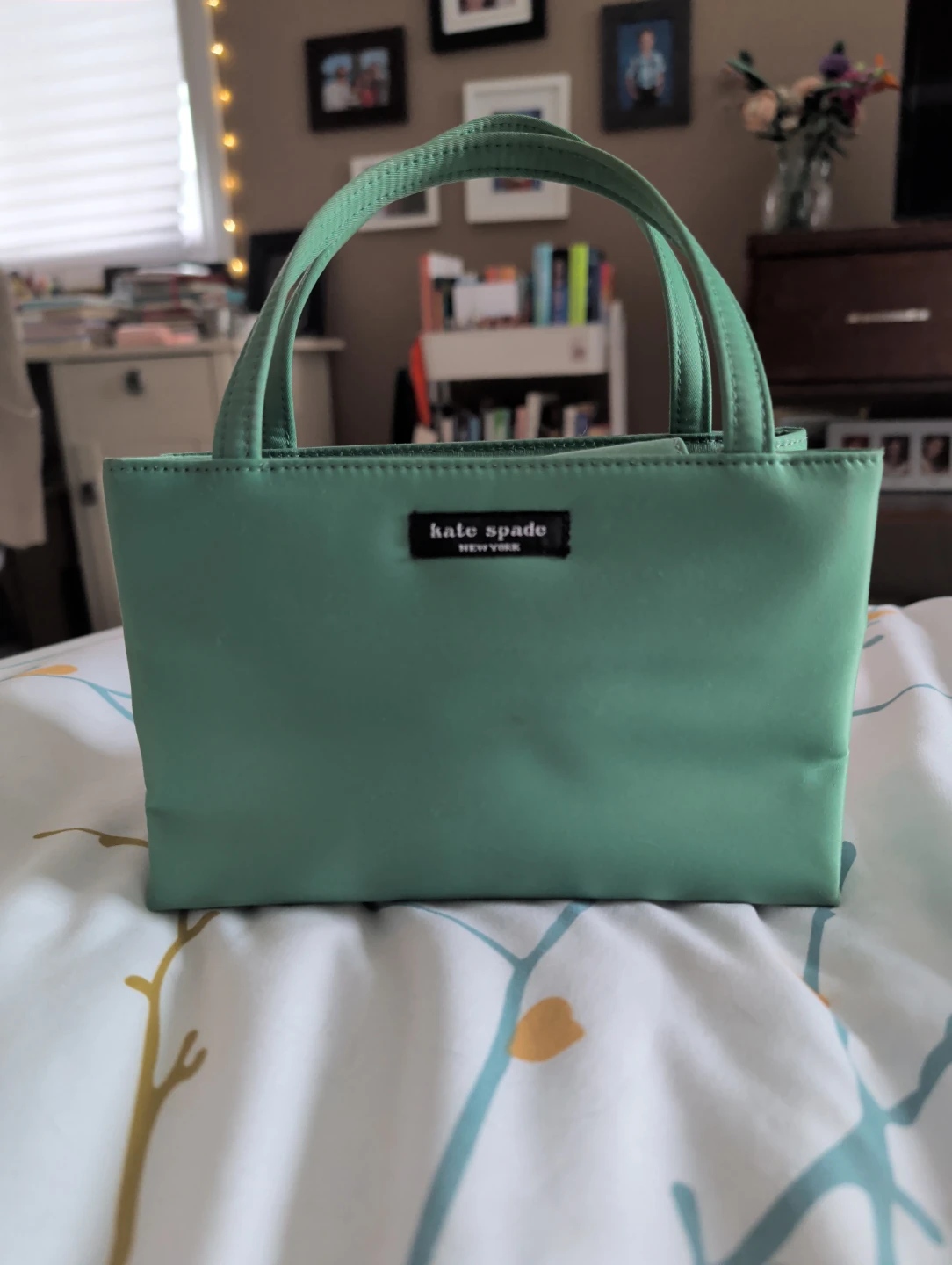 This is a cute mint green tote bag from Kate Spade New York. It's a great size for everyday essentials. The bag is made from a smooth, durable material.