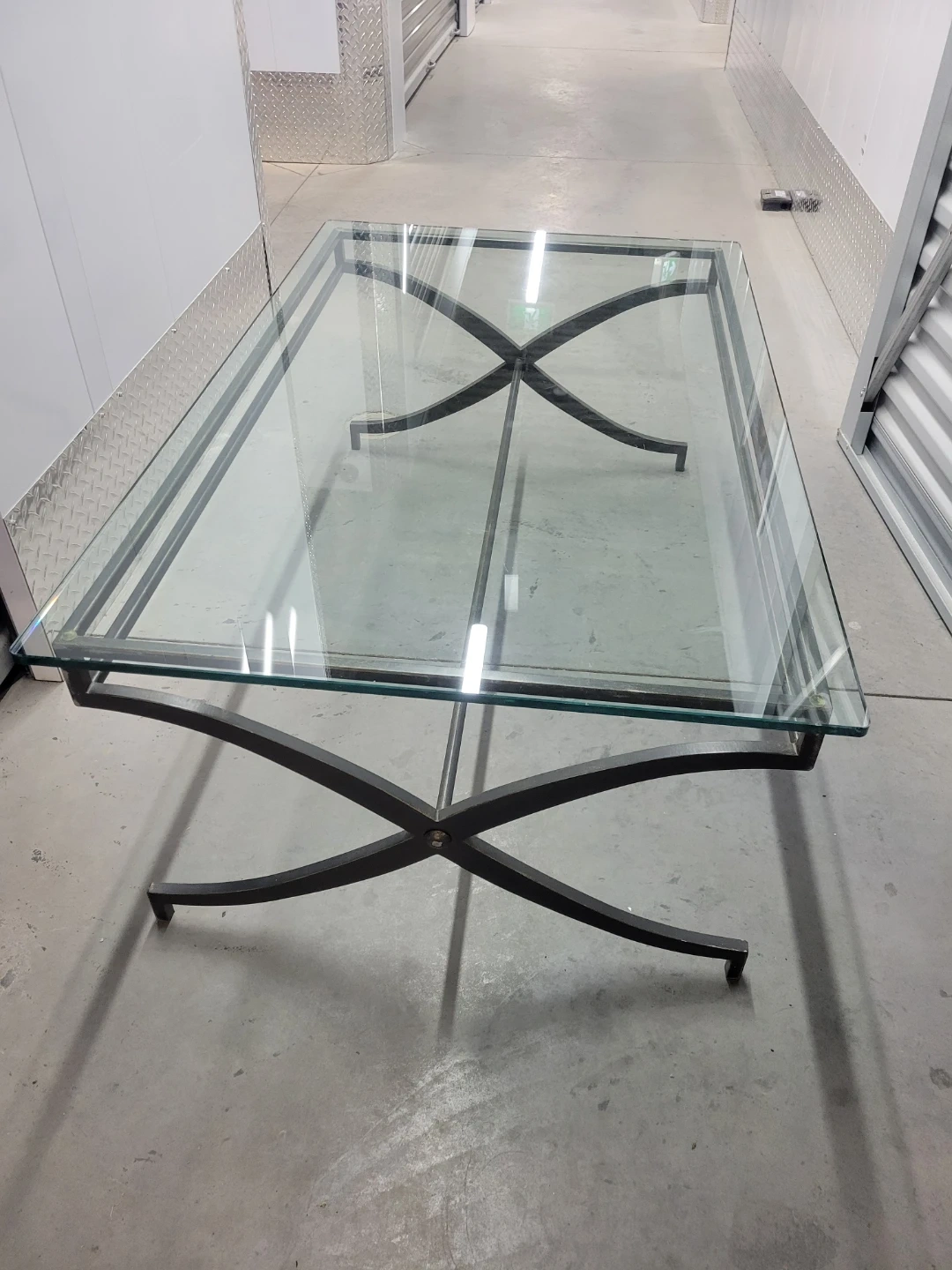 Rectangular glass top coffee table with a decorative metal base. It features a clear glass surface and a dark metal frame with X-shaped accents. This table would be a nice addition to a living room.