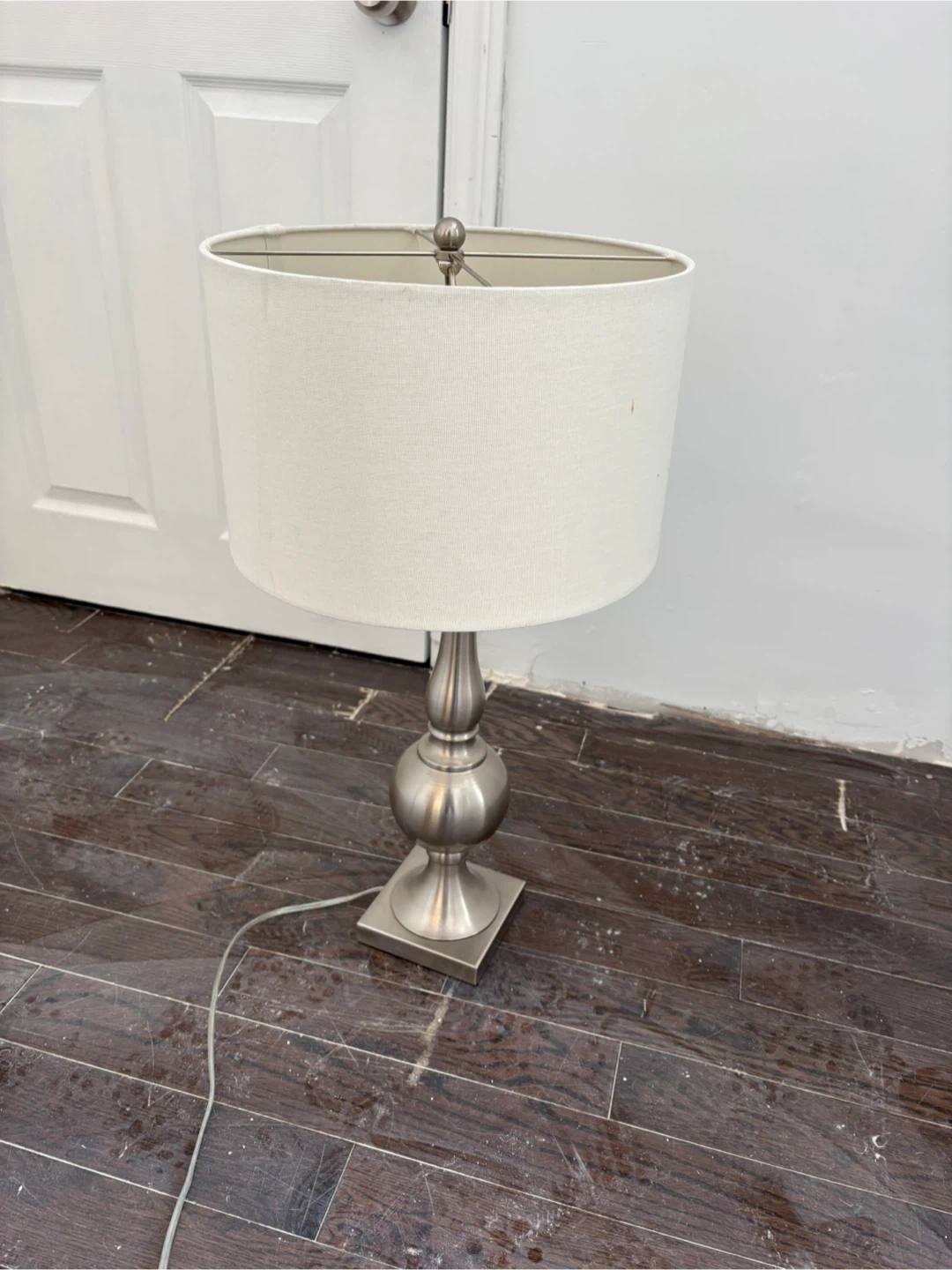 A nice table lamp with a brushed silver finish and a white fabric drum shade. It's got a classic design with a stacked ball accent on the base. Perfect for adding a touch of light to any room.