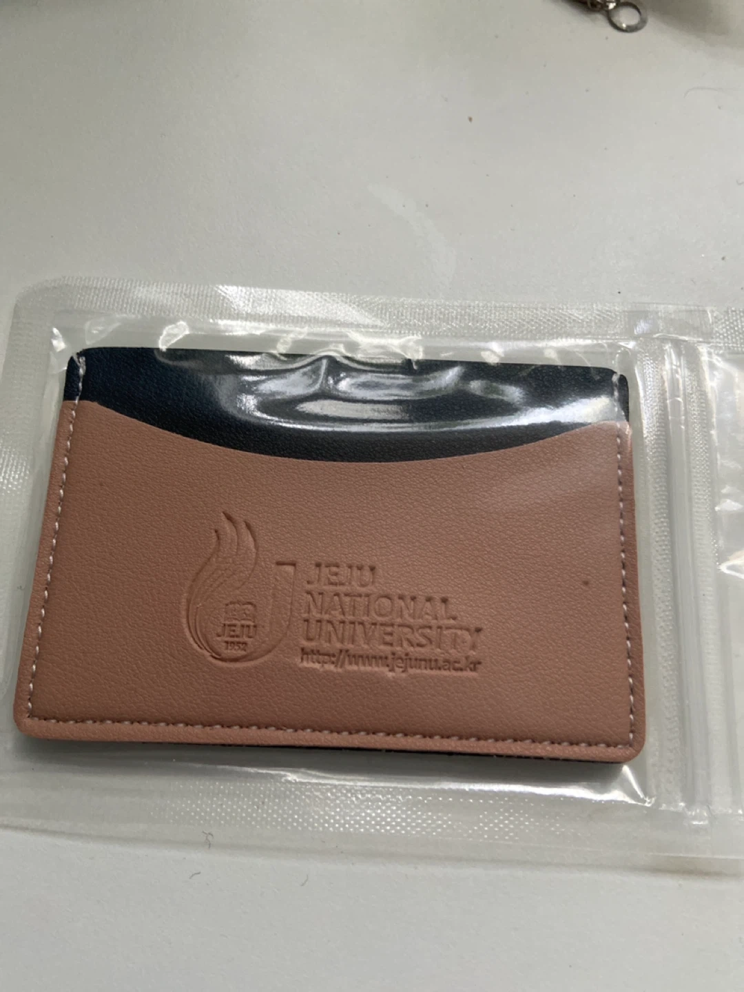 Card holder from Jeju National University. It's made of faux leather in a two-tone design with beige and black. Features the university logo and website printed on the front.
