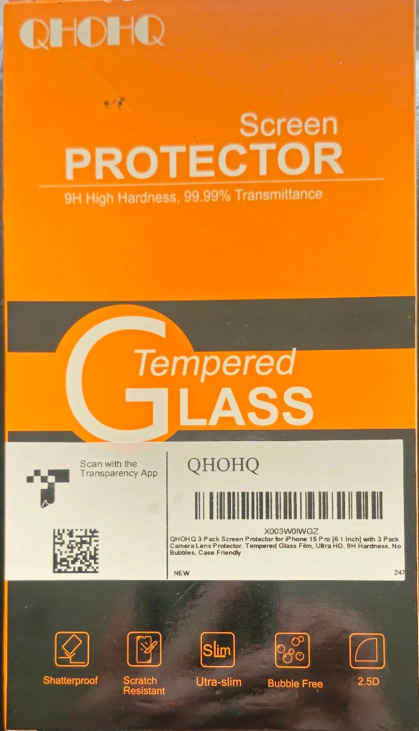 This is a 3-pack of QHOHQ tempered glass screen protectors designed for the iPhone 15 Pro. They offer 9H hardness and 99.99% transmittance. The protectors are ultra-slim, scratch-resistant, bubble-free, and case-friendly. Installation accessories are included.
