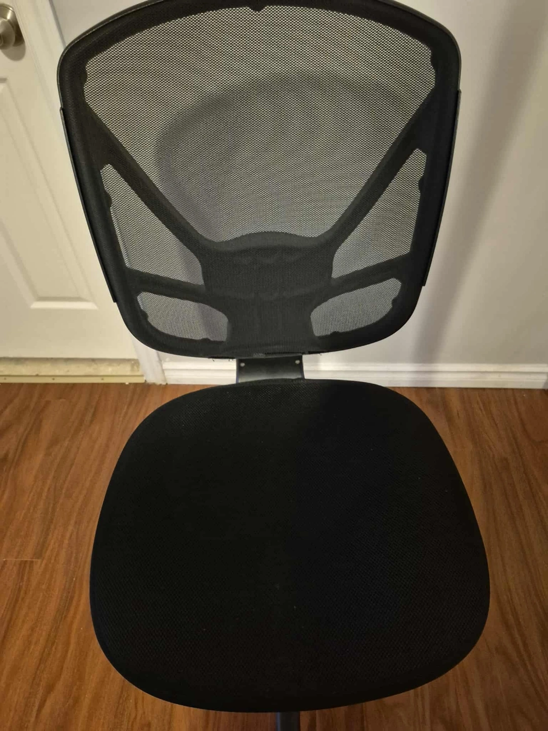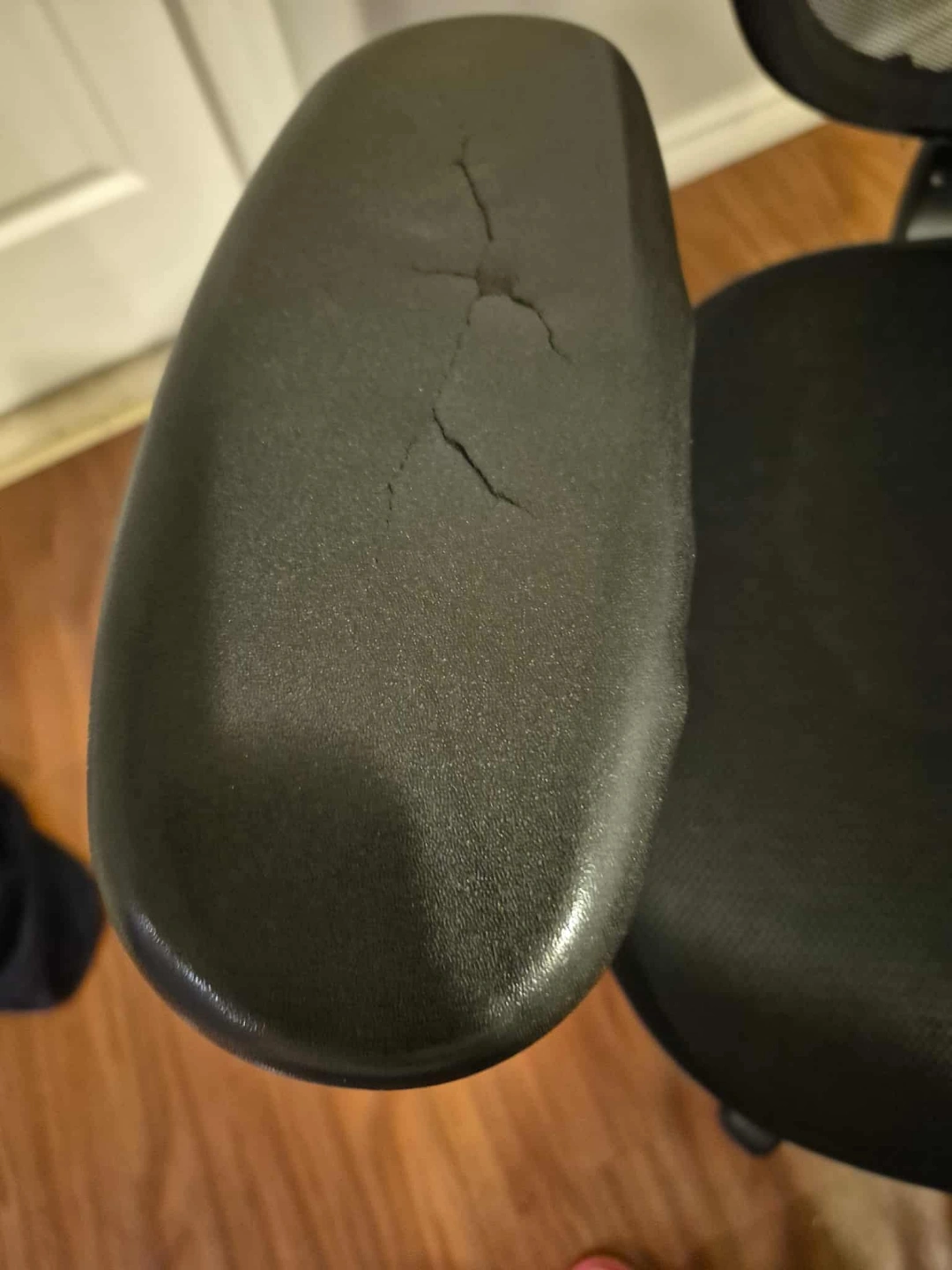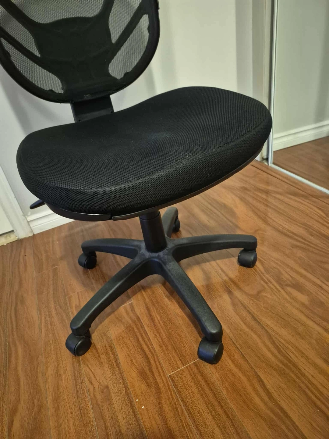 Comfortable office chair, mesh back, black fabric seat. Adjustable height. One armrest shows some cracks. foldable handles with adjustable height.