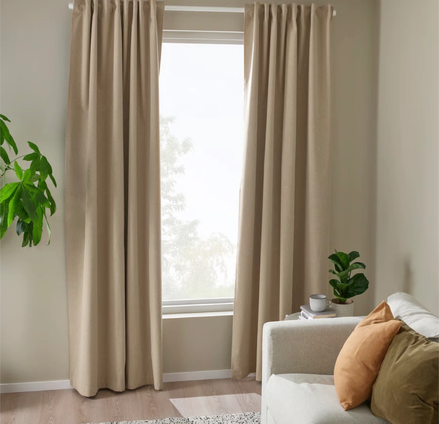 Adjustable curtain rod with a neutral beige fabric panel. Rod extends from 52 to 96 inches. Fabric panel measures 40 inches wide by 84 inches long. It's designed for easy installation. Great for covering windows!