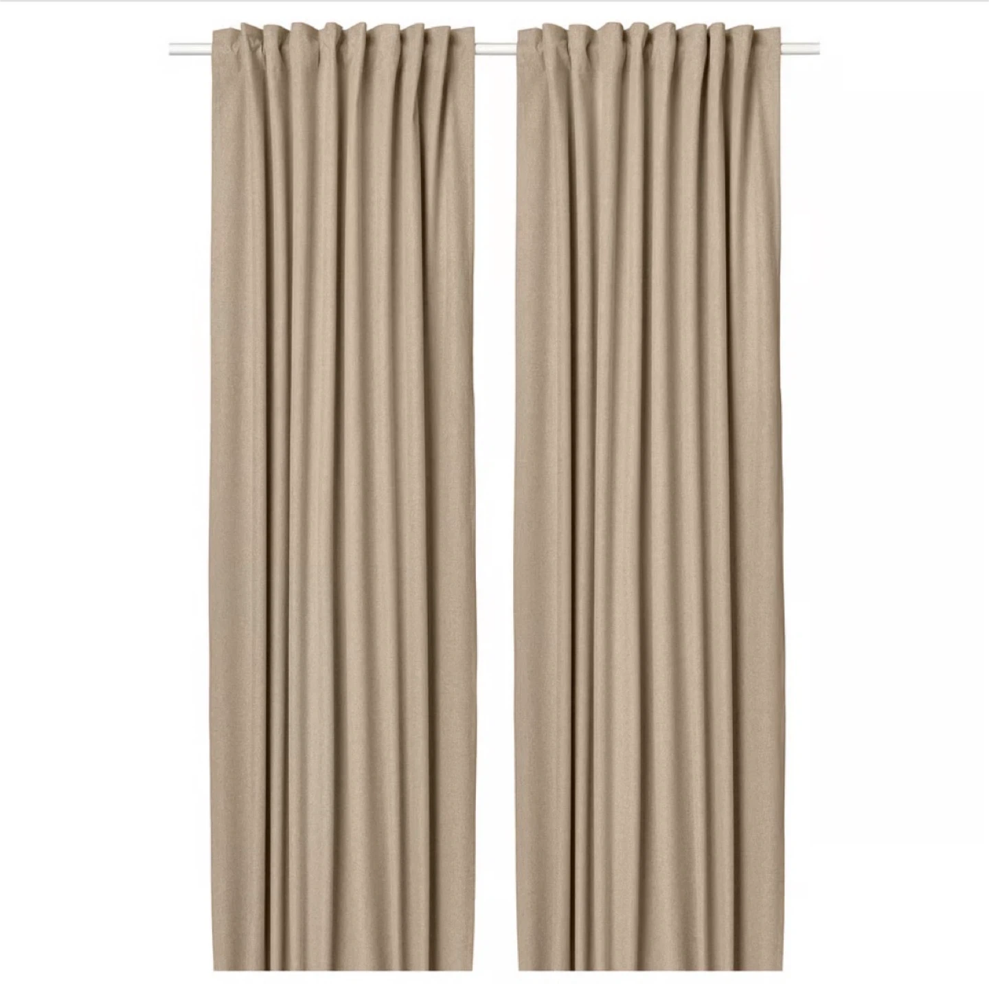 Adjustable curtain rod with a neutral beige fabric panel. Rod extends from 52 to 96 inches. Fabric panel measures 40 inches wide by 84 inches long. It's designed for easy installation. Great for covering windows!