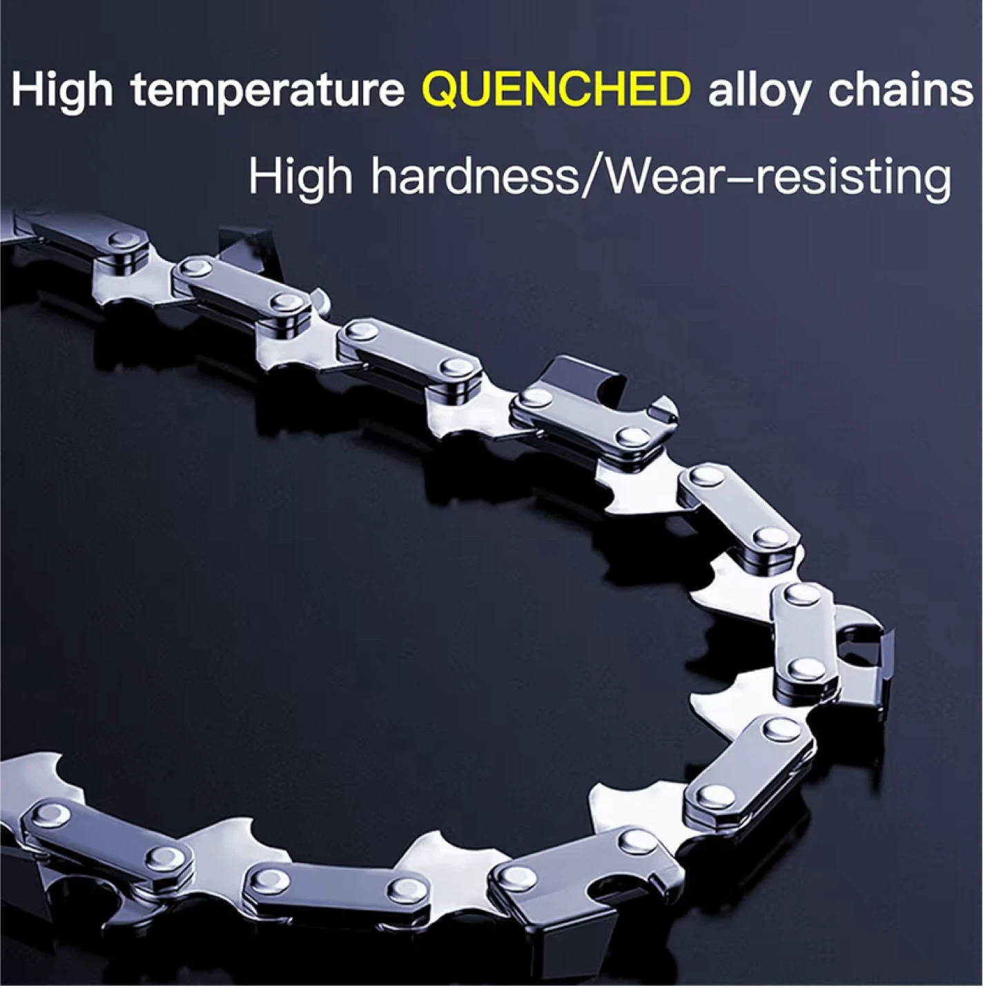 Set of two high-quality, wear-resisting alloy chainsaw chains. These chains are designed for use with 6-inch guide bars. They're made from quenched alloy for high hardness and durability. Use these chains for efficient cutting in various applications.