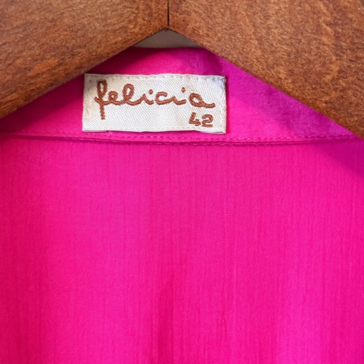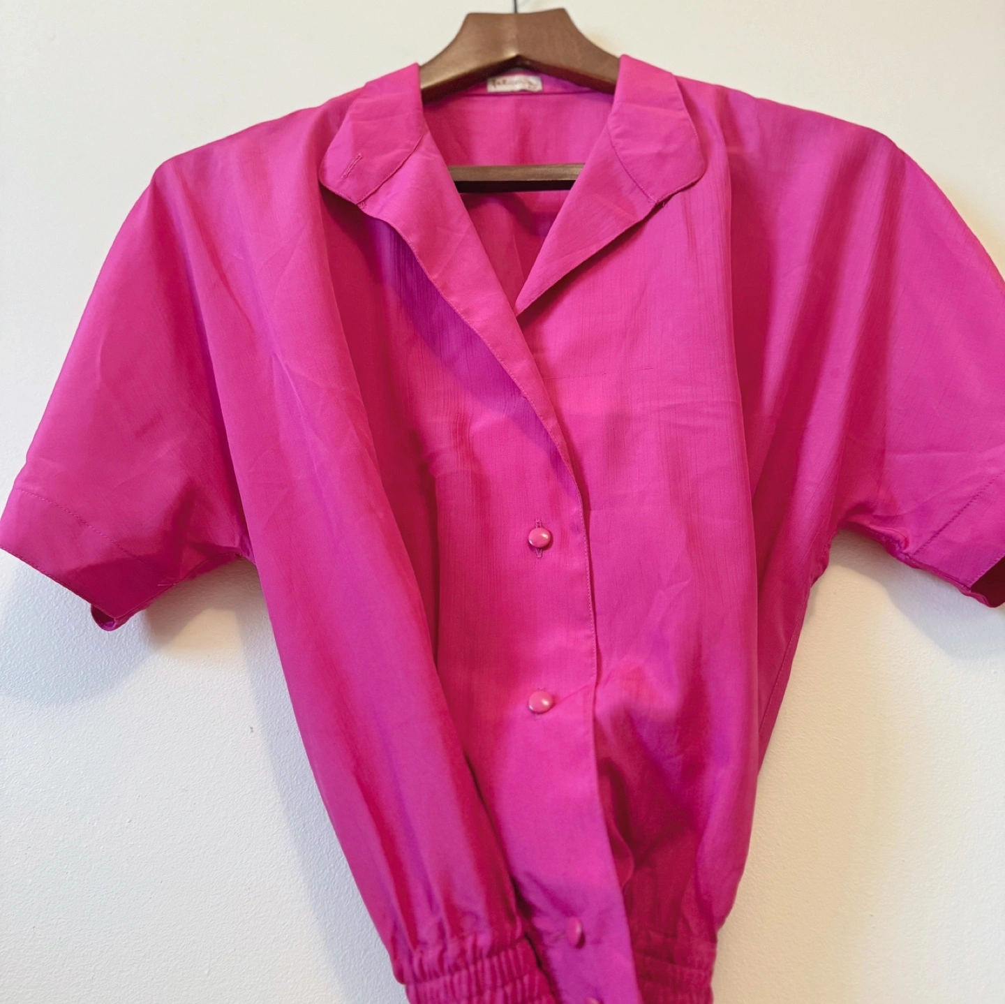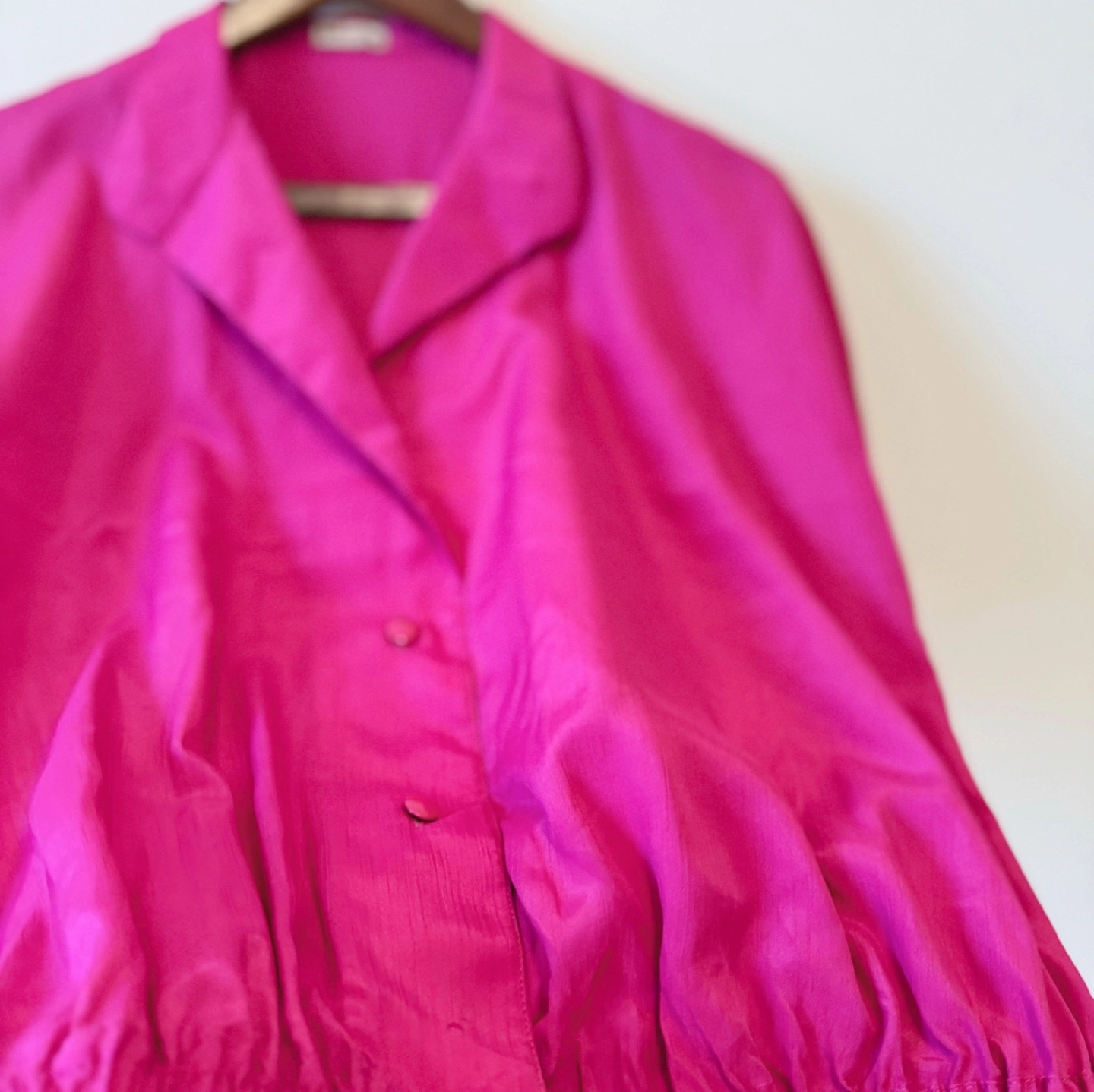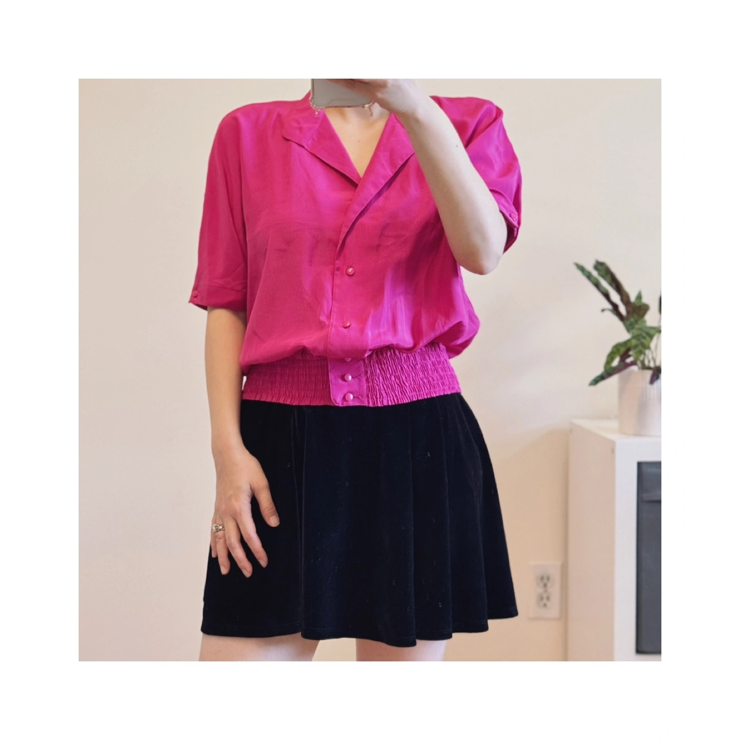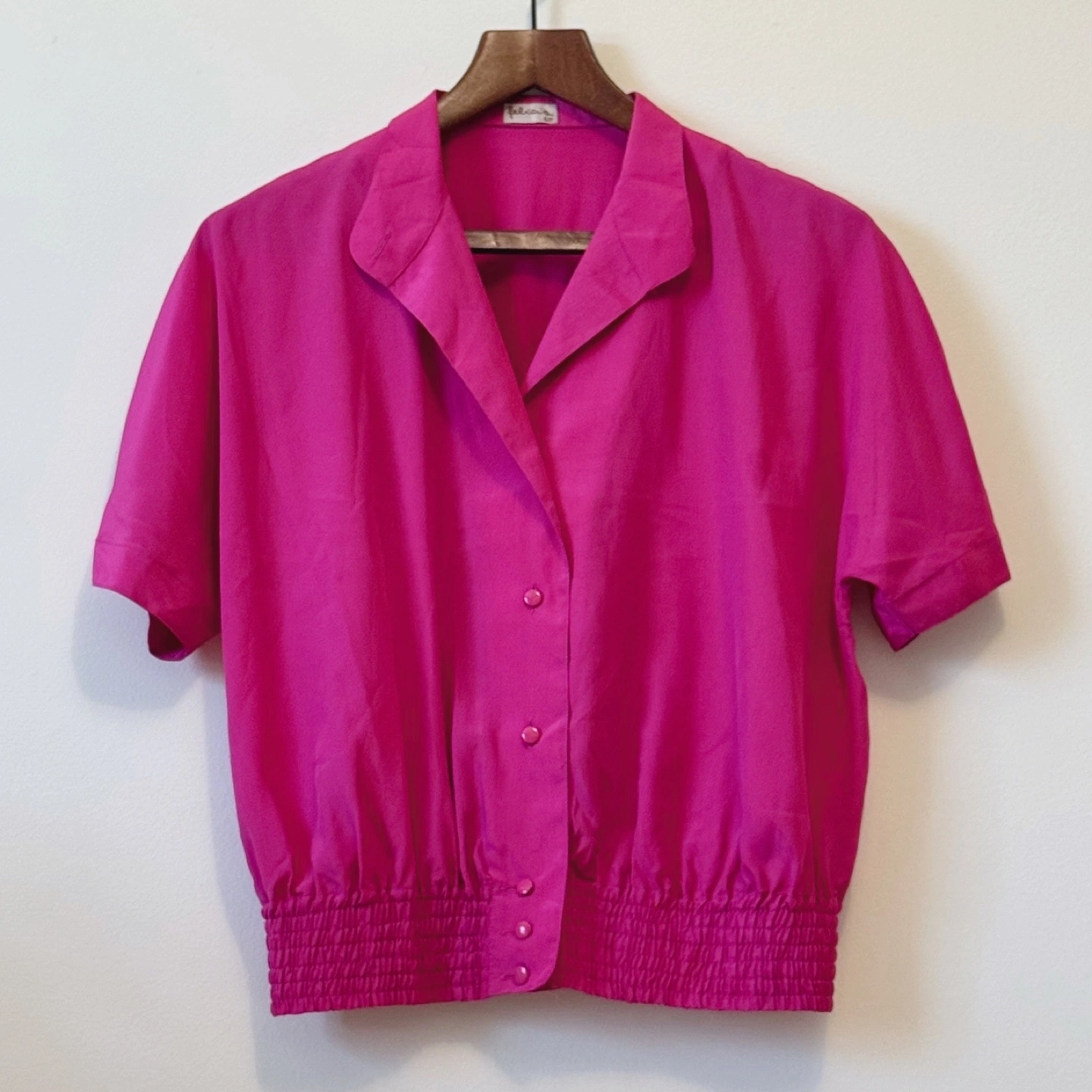 A rare European vintage blouse made in West Germany, featuring a bold magenta color and a classic collared design. The smocked hem and button-down front add to its unique charm. A true statement piece for vintage lovers!