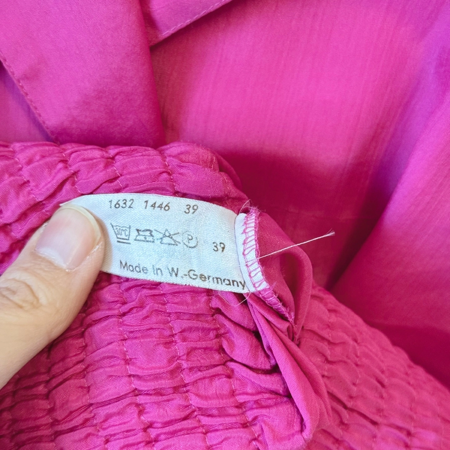 A rare European vintage blouse made in West Germany, featuring a bold magenta color and a classic collared design. The smocked hem and button-down front add to its unique charm. A true statement piece for vintage lovers!