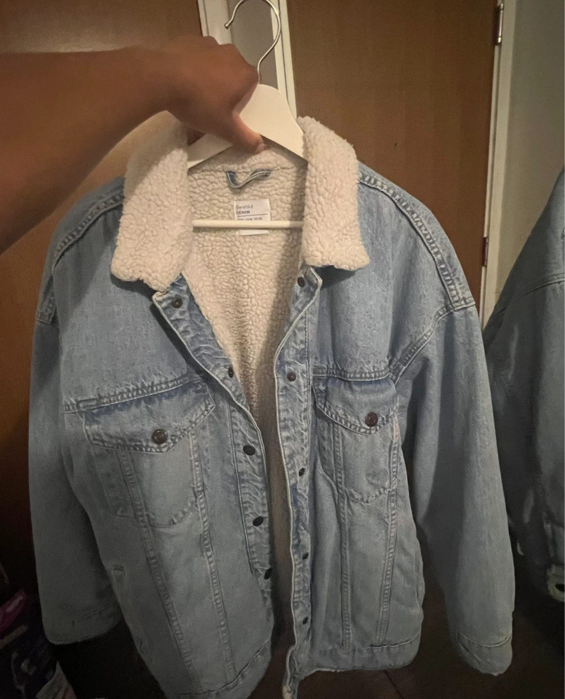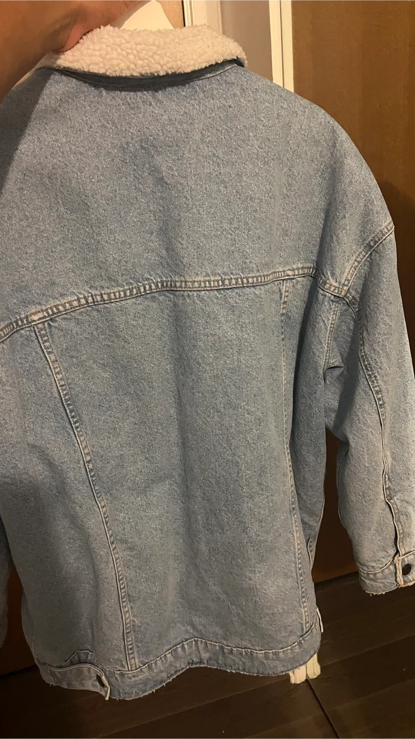 (European brand) This Bershka denim jacket features a sherpa fleece lining for warmth. It's a classic blue wash with button closures and chest pockets. Great for cooler weather!