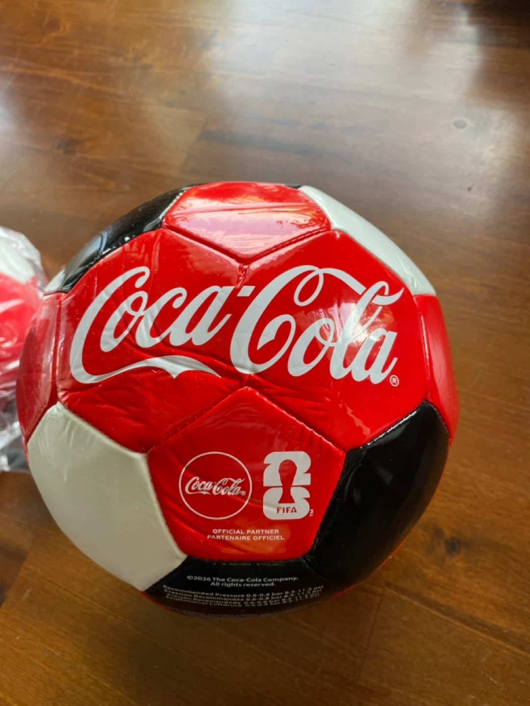 This is a Coca-Cola branded soccer ball. It features the official Coca-Cola logo and FIFA partnership branding. Recommended pressure is 0.6-0.8 bar.