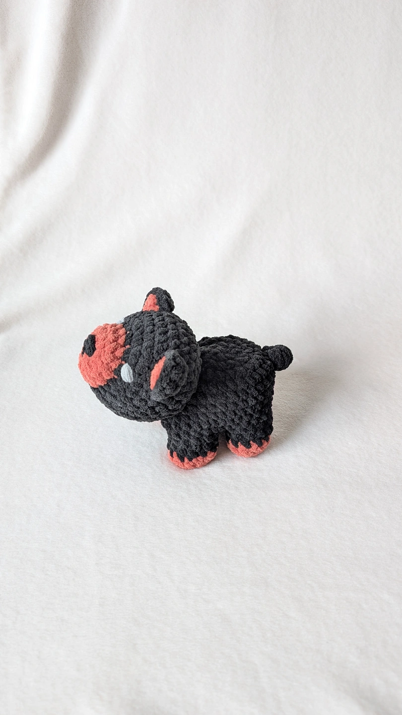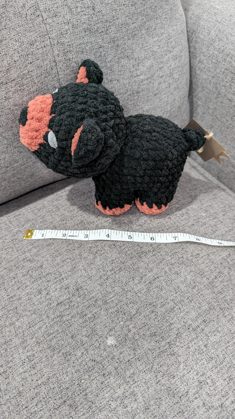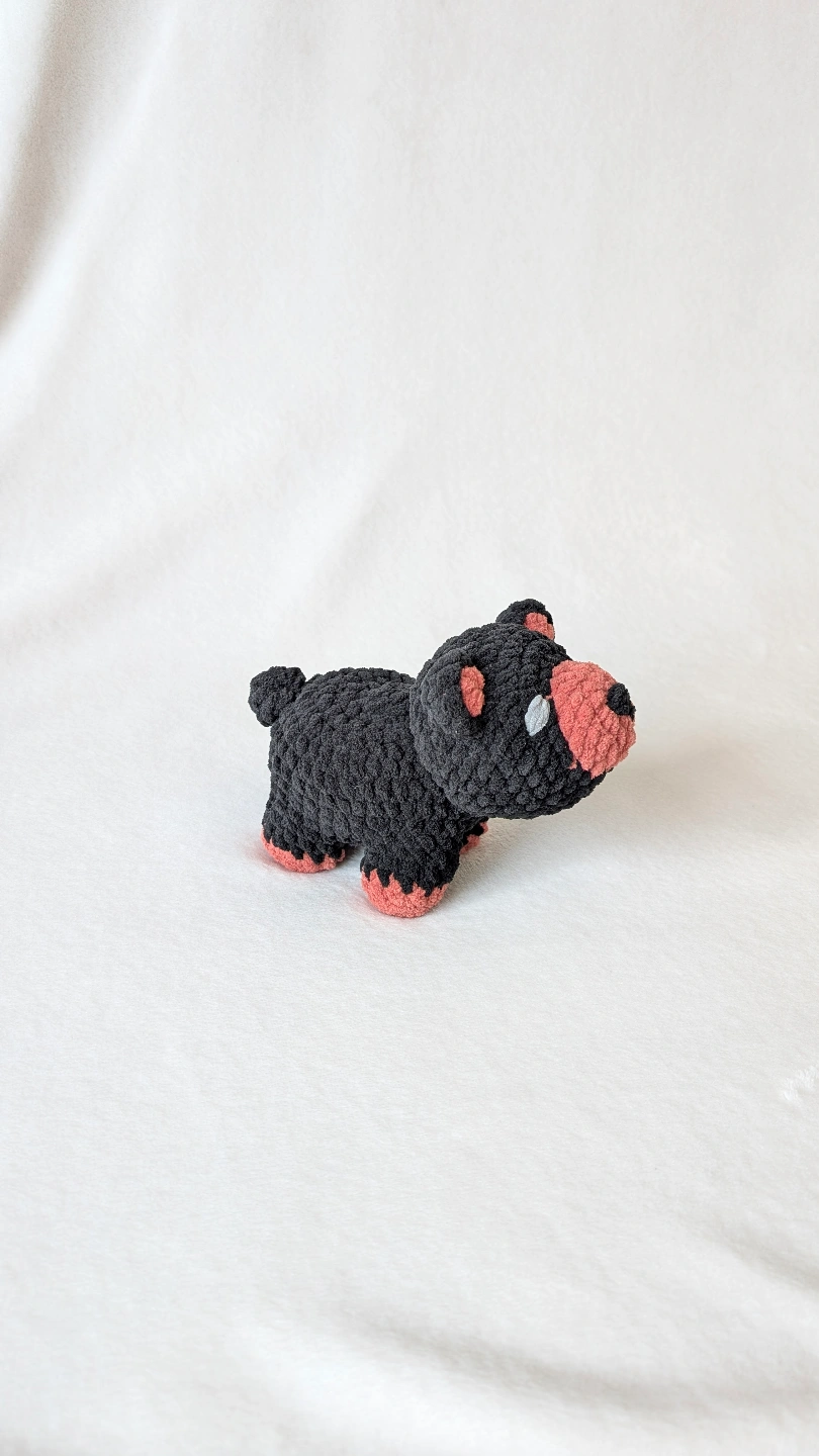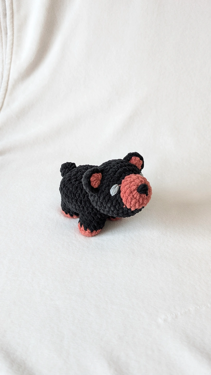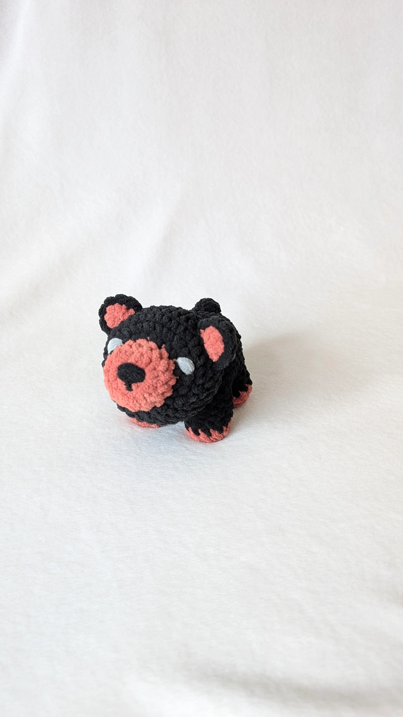 Small crocheted bear. Black and coral coloured.