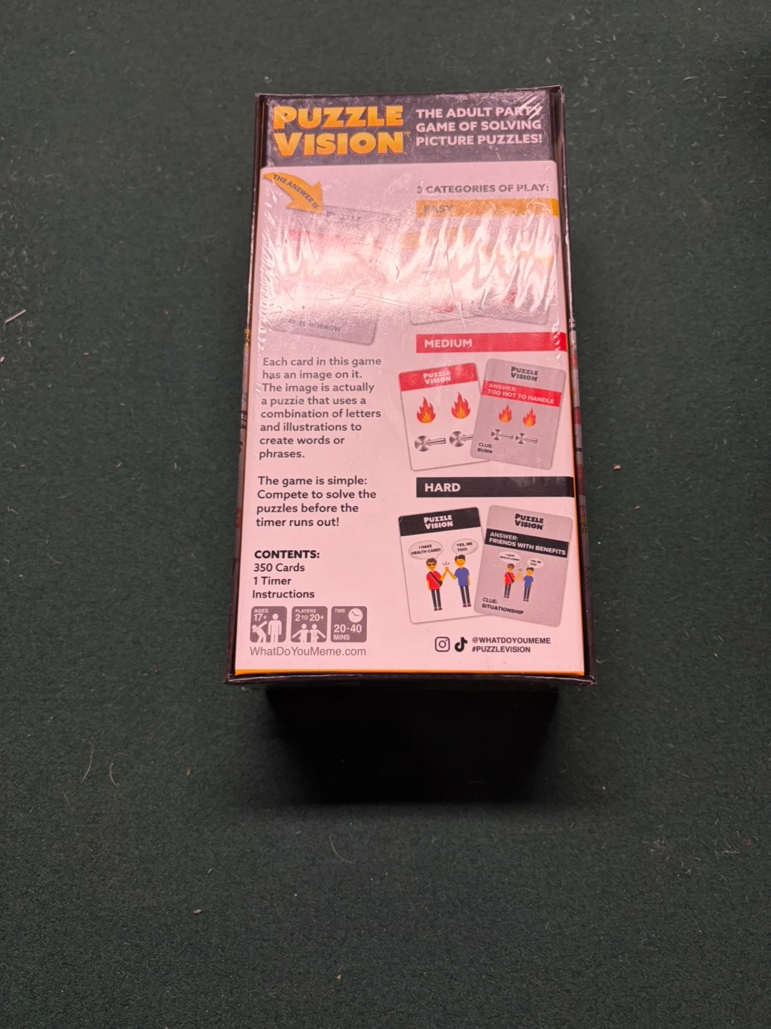 This is the adult party game Puzzle Vision. It's a game of solving picture puzzles! The game includes 350 cards and instructions. It's designed for ages 17 and up, 2-6 players, and plays in 20-40 minutes.brand new see pictures for information
