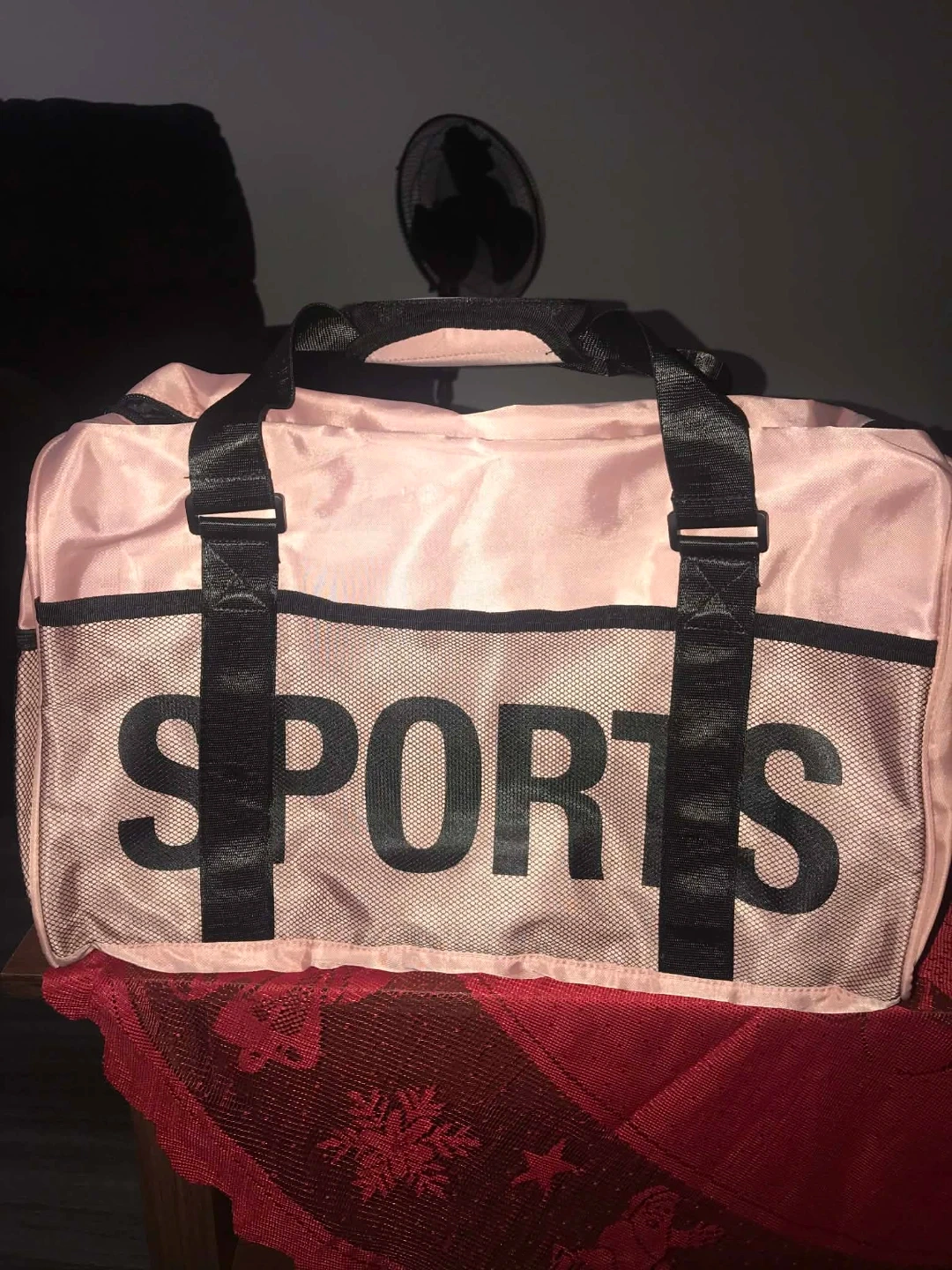 Selling a cute pink duffle bag with 'SPORTS' printed on the front. It has black straps and trim, and a spacious interior with multiple pockets for organization. Perfect for the gym or a weekend getaway!