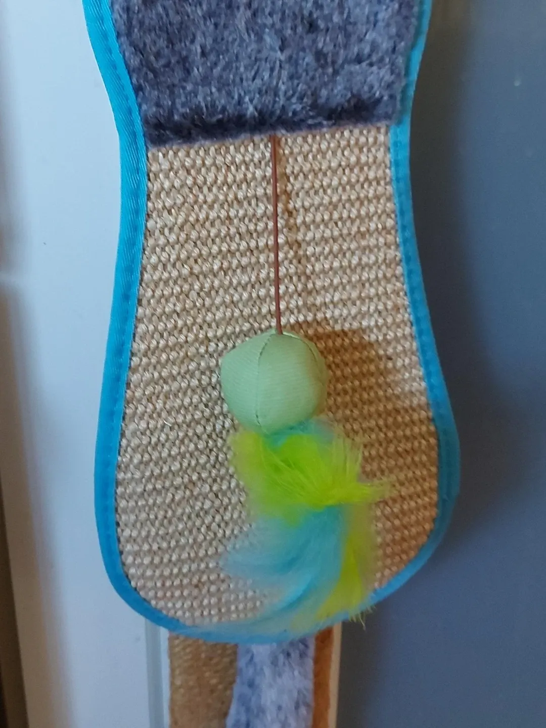 A cat scratching pad made with sisal rope and plush fabric. It has a dangling toy with feathers attached. Great for keeping your cat entertained and their claws healthy! Unfortunately, my cats don't bother with it. So it is unused...