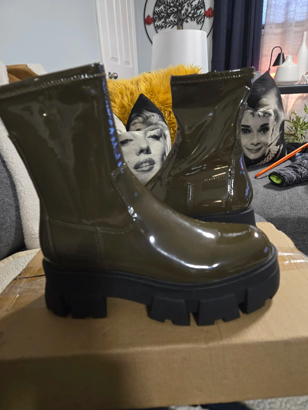 Selling a pair of Aldo Call It Spring boots in a unique olive green colour! These boots are a US size 8, EUR 38.5, and UK 5.5. They have a chunky platform sole. Perfect for adding a bit of edge to your outfit!