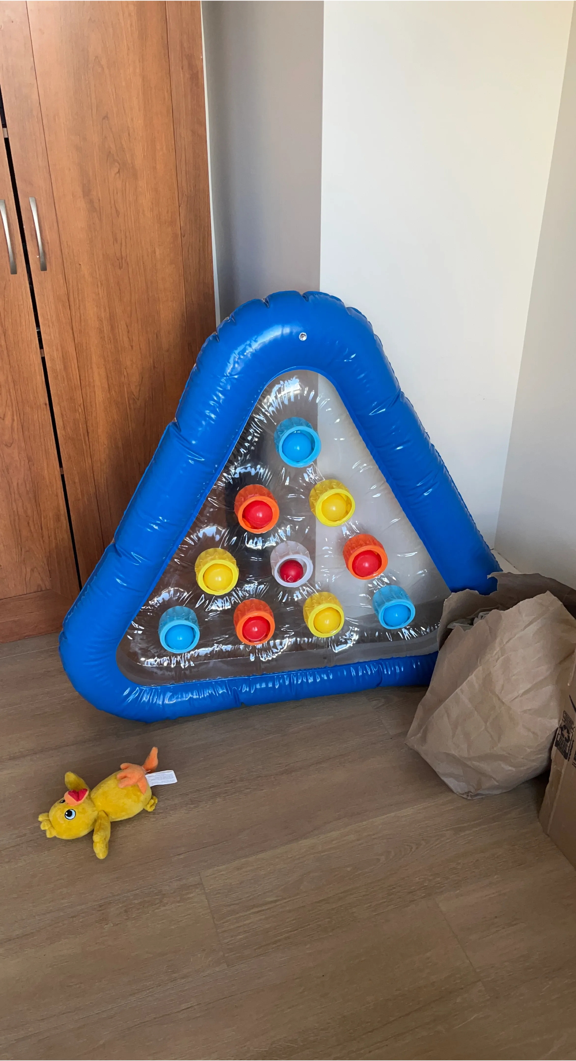 This is an inflatable tummy time water mat for babies. It's in good condition and ready for a new home! It's blue and triangle-shaped, with colourful floating toys inside.