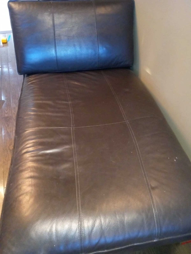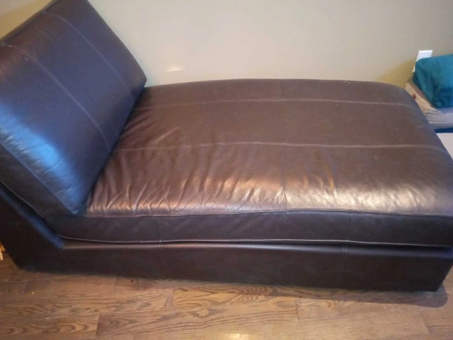 This is a used leather chaise lounge perfect for relaxing! Cosy up with a book or stretch out for a nap on this stylish piece. I've enjoyed having it, but it's time for it to find a new home. There are some signs of wear, which add character to its comfy appeal. If the ad is still up, it's still available, so no need to ask! Don't miss out on adding this gem to your space!
