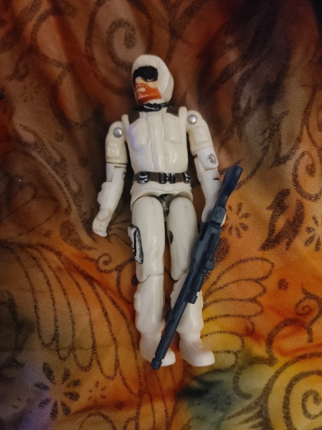 This is a vintage G.I. Joe Snow Serpent action figure from the 1980s. It's made of plastic and comes with a rifle accessory. The figure's articulation allows for various poses.