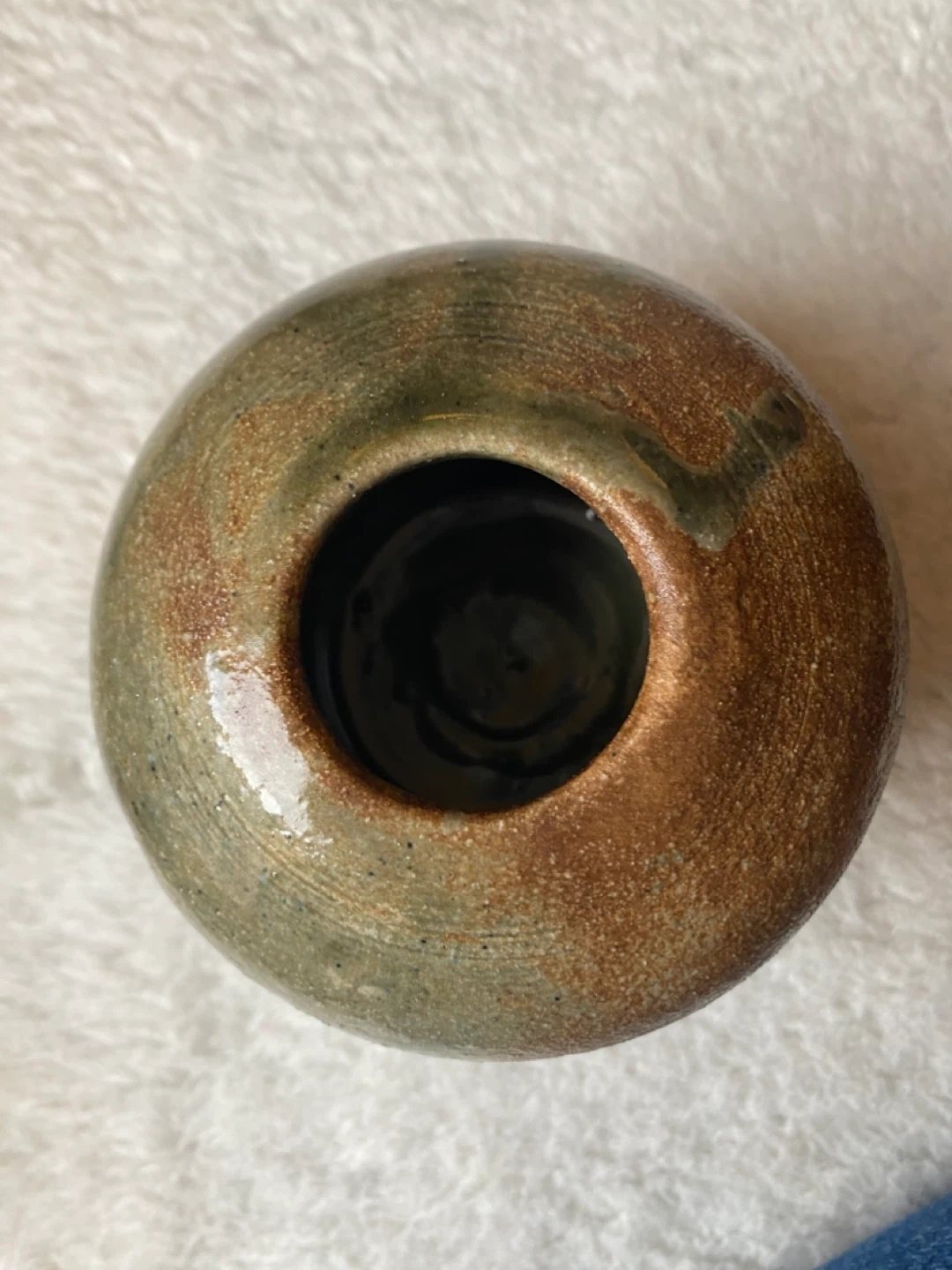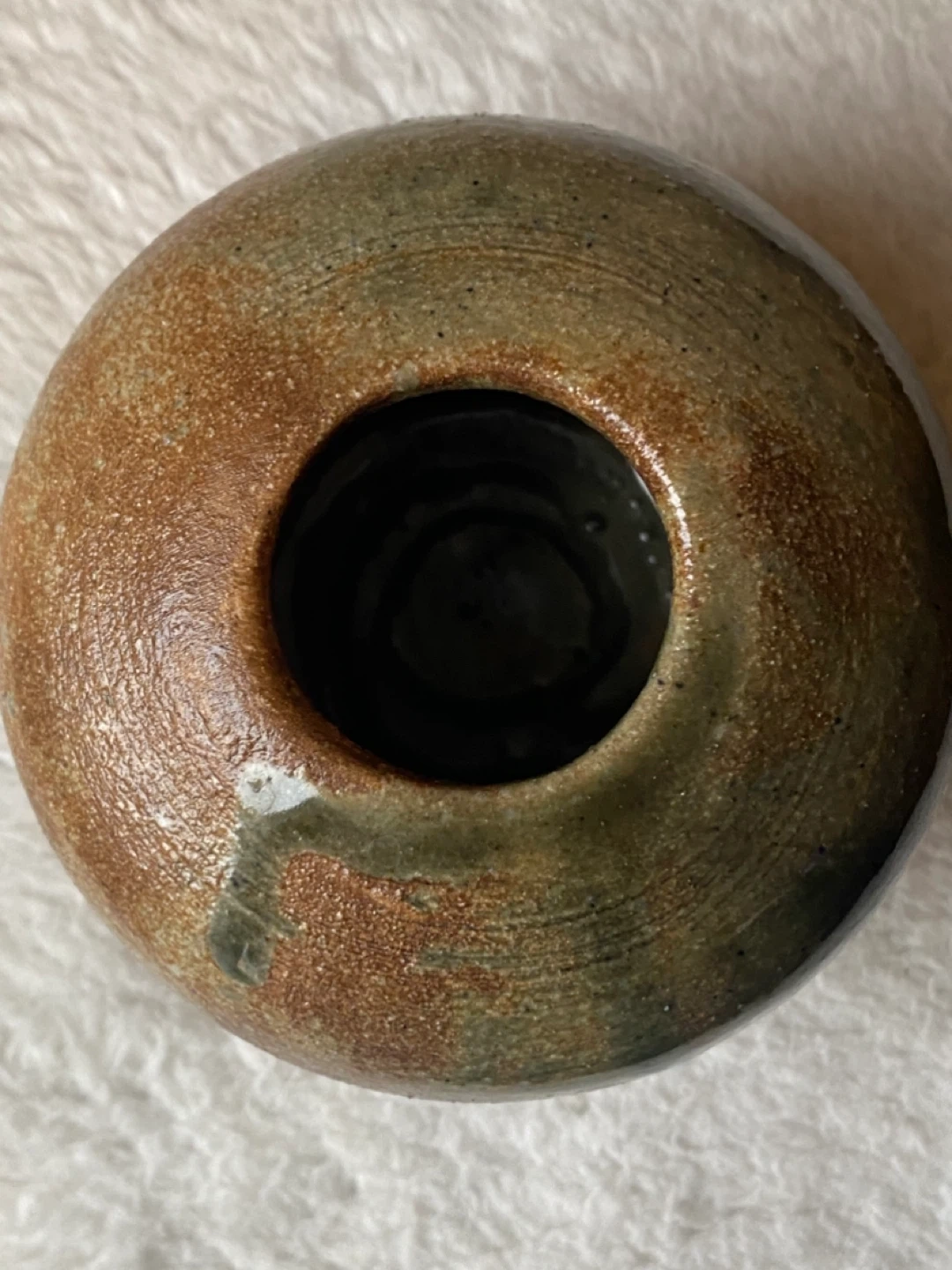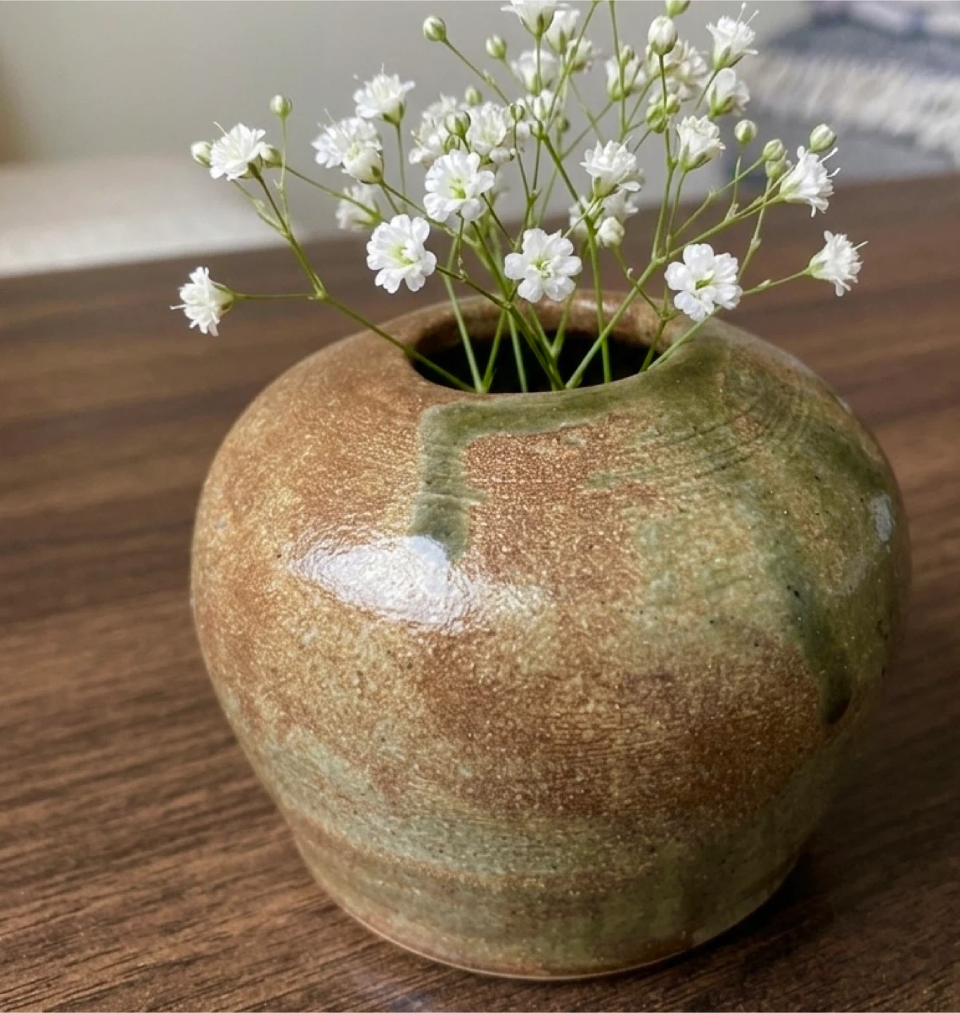 A charming small ceramic bud vase with a rustic, earthy glaze. Green and brown tones work well with dried flowers.