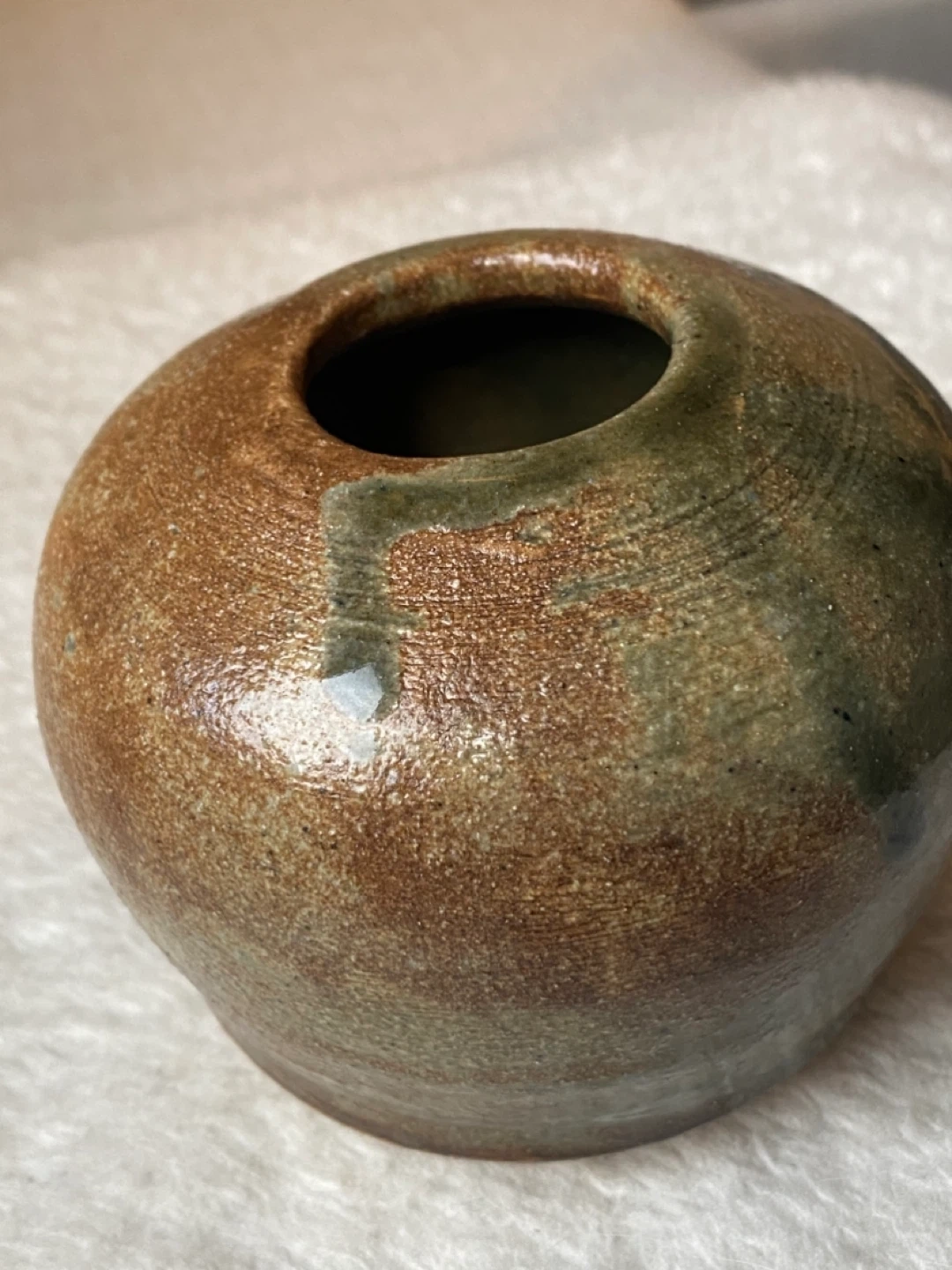 A charming small ceramic bud vase with a rustic, earthy glaze. Green and brown tones work well with dried flowers.