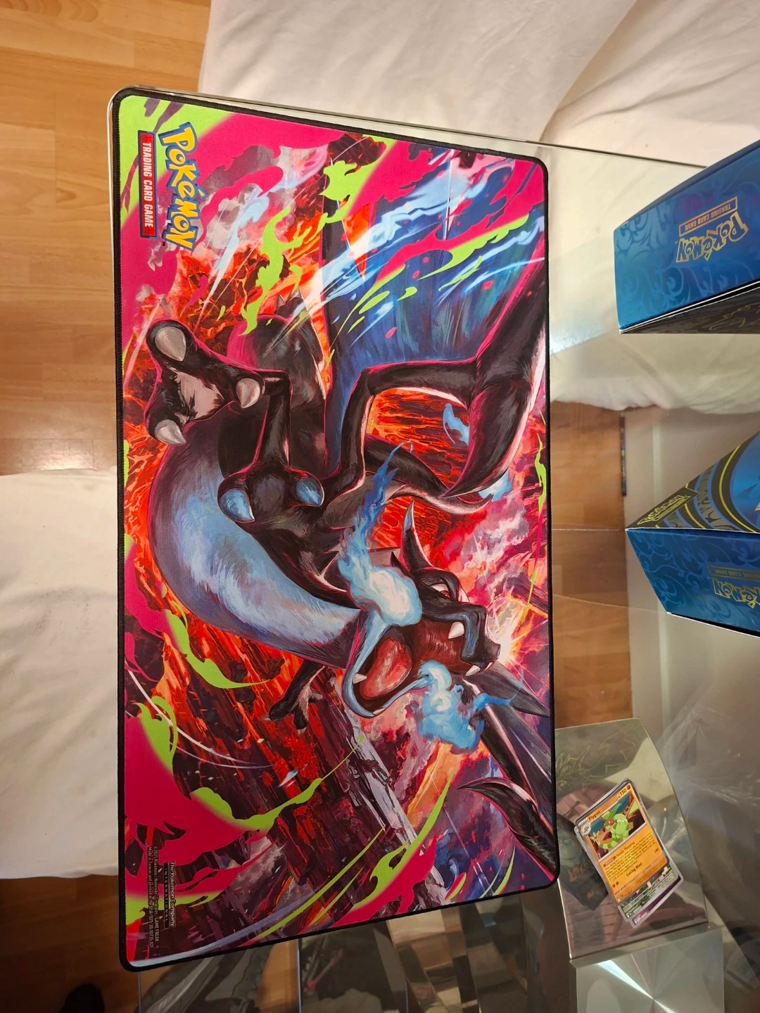 Vibrant Charizard playmat for the Pokemon Trading Card Game. Includes two Elite Trainer Boxes featuring holographic Charizard designs. Protect your cards and level up your game!