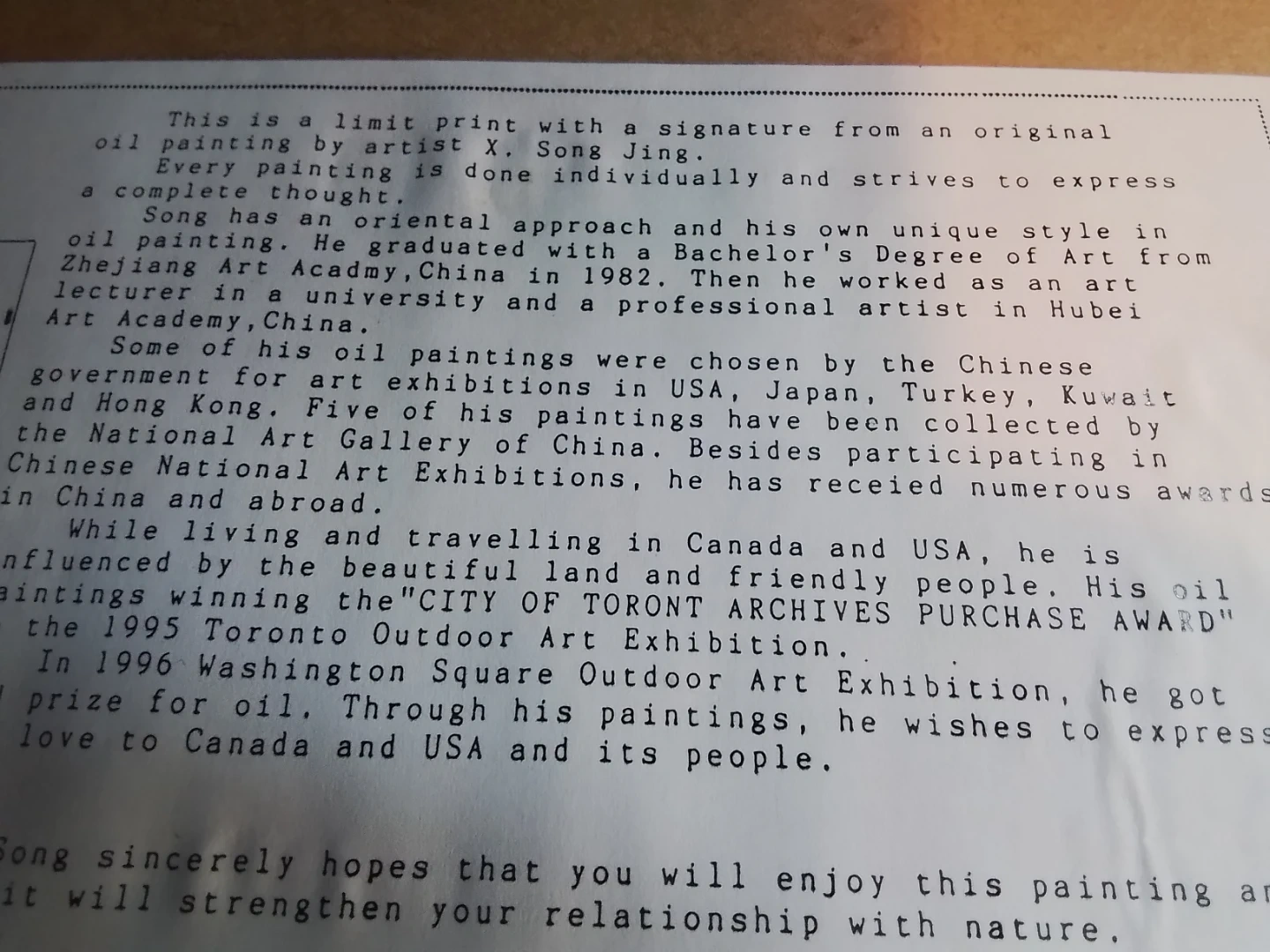 This limited edition Song Jing print is a stunning piece featuring a signature from an original oil painting by the artist X. Song Jing, numbered 7/100. This print showcases Song's unique oriental style and his experiences in China, Canada, and the USA. It is framed and ready to add a touch of elegance to any space.