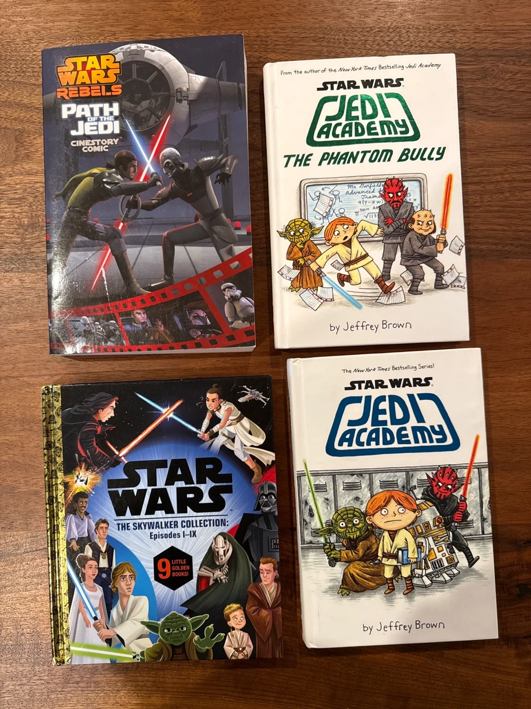 A bundle of Star Wars books including 'Star Wars Rebels: Path of the Jedi', 'Star Wars Jedi Academy: The Phantom Bully', and 'Star Wars The Skywalker Collection: Episodes I-IX'. The Skywalker Collection contains 9 Little Golden Books. These are perfect for young Star Wars fans learning to read.