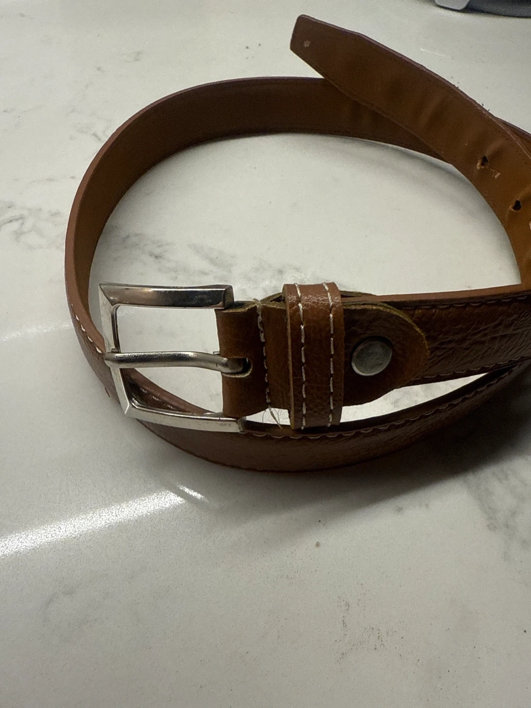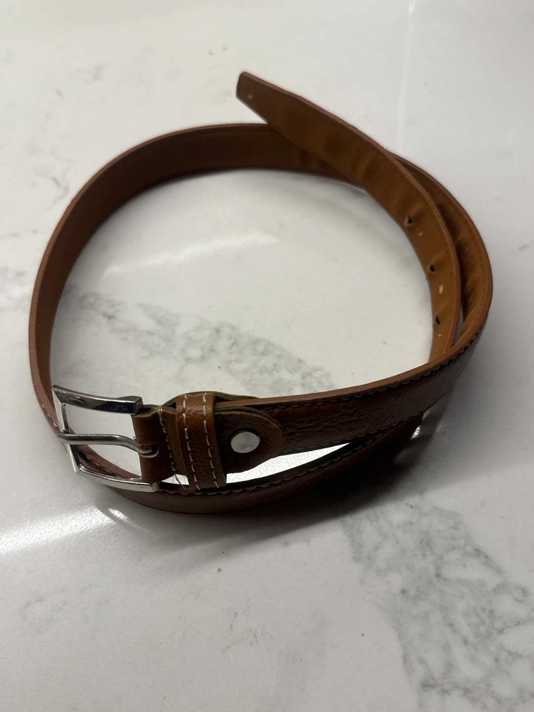 Classic brown belt crafted from genuine leather. Features a silver-toned buckle and white stitching detail. Made in China. Its a size L but fits a XS. Never worn.