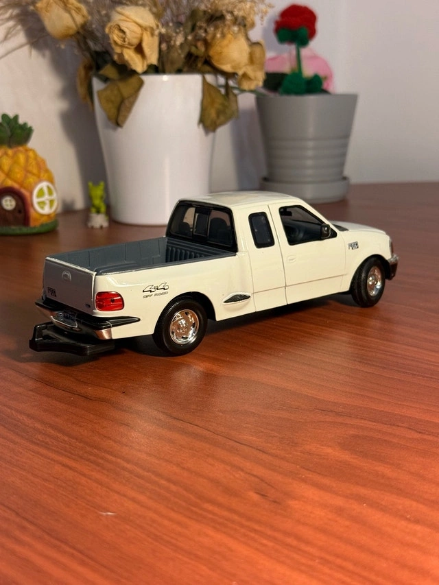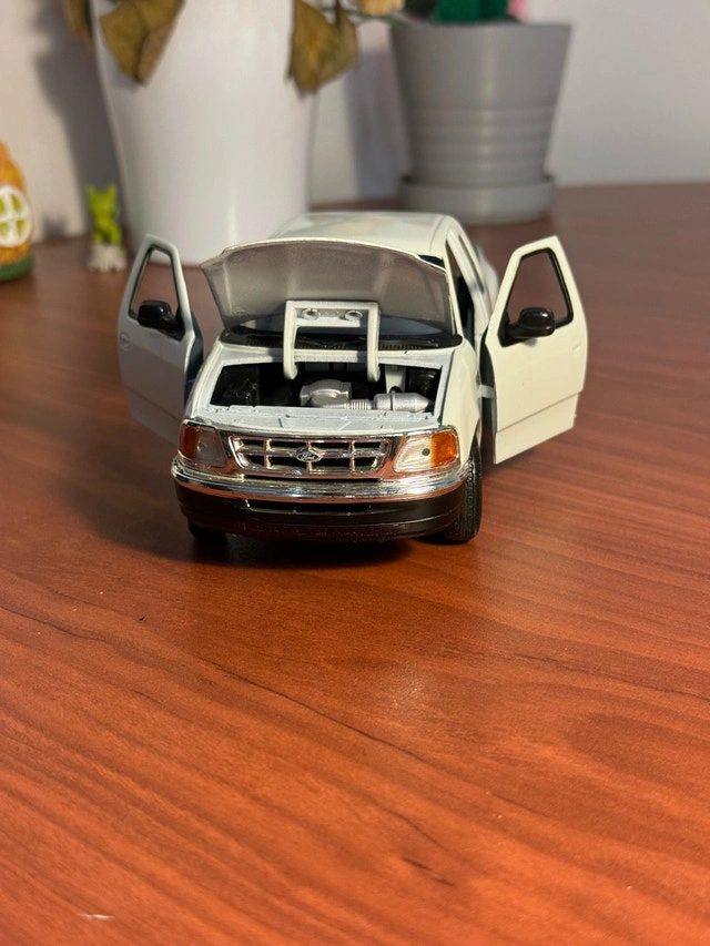 This is a used, good condition 1/24 scale diecast model of the 2001 Ford F-150 XLT Flareside Supercab Pickup Truck by Motormax. It's approximately 9 inches long and features an accurate body profile, including the unique flared rear fenders. Made of diecast metal with some plastic parts and real rubber tires. The doors, hood, and tailgate open. It has a detailed interior, engine bay, and chassis. A great item for Ford enthusiasts or diecast collectors.