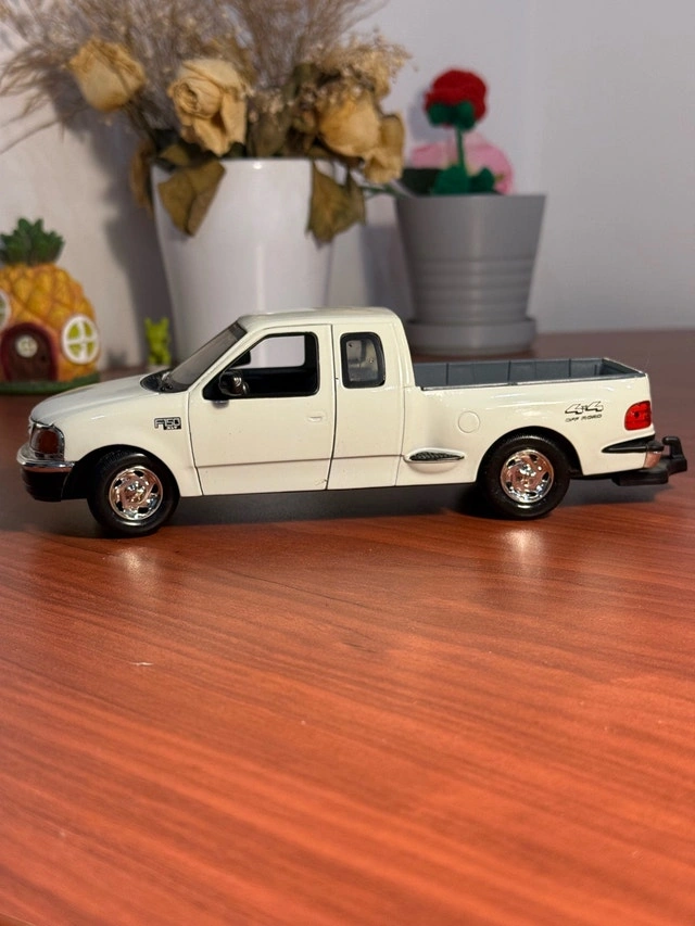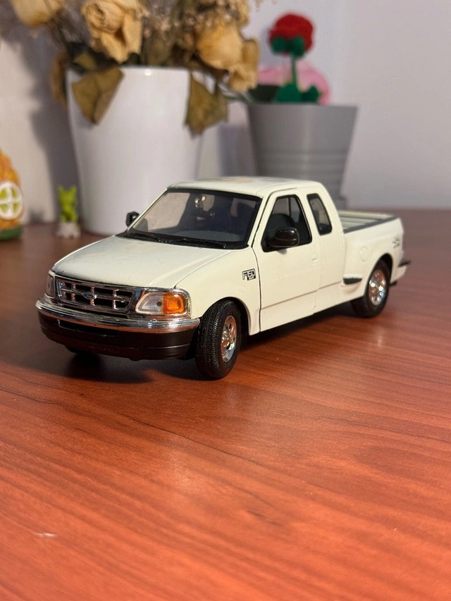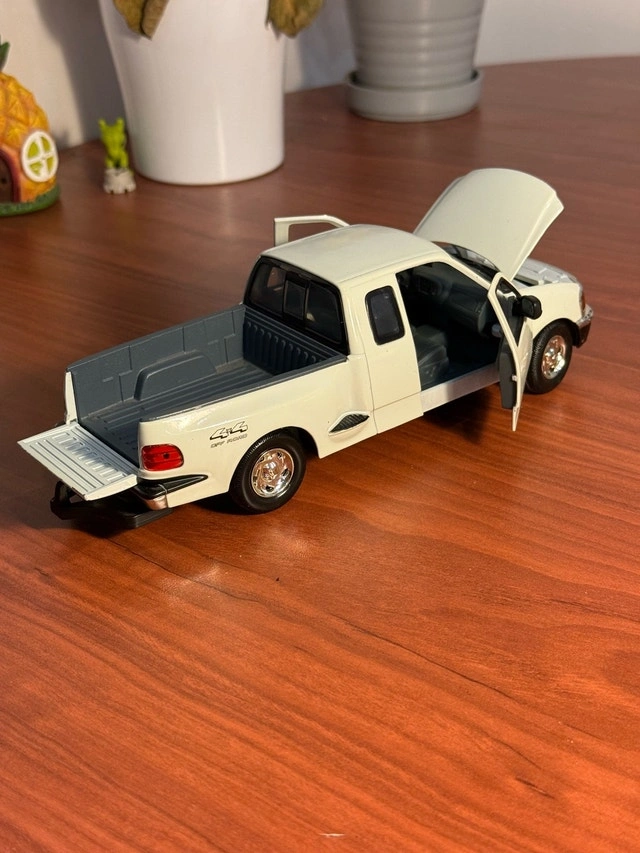 This is a used, good condition 1/24 scale diecast model of the 2001 Ford F-150 XLT Flareside Supercab Pickup Truck by Motormax. It's approximately 9 inches long and features an accurate body profile, including the unique flared rear fenders. Made of diecast metal with some plastic parts and real rubber tires. The doors, hood, and tailgate open. It has a detailed interior, engine bay, and chassis. A great item for Ford enthusiasts or diecast collectors.