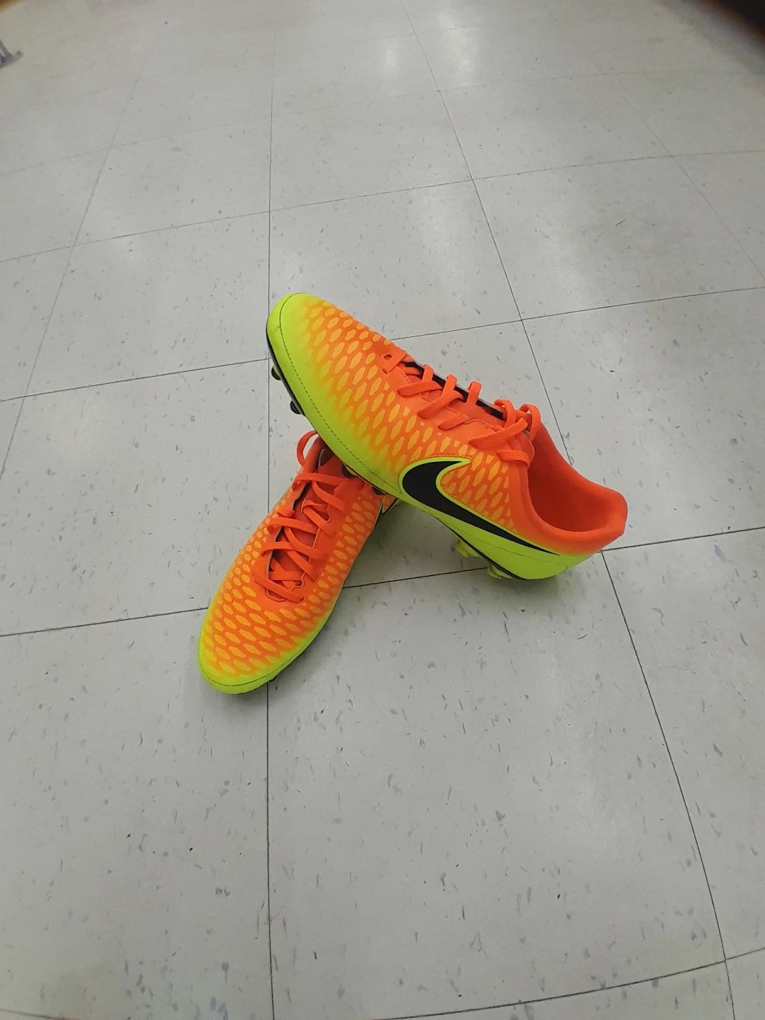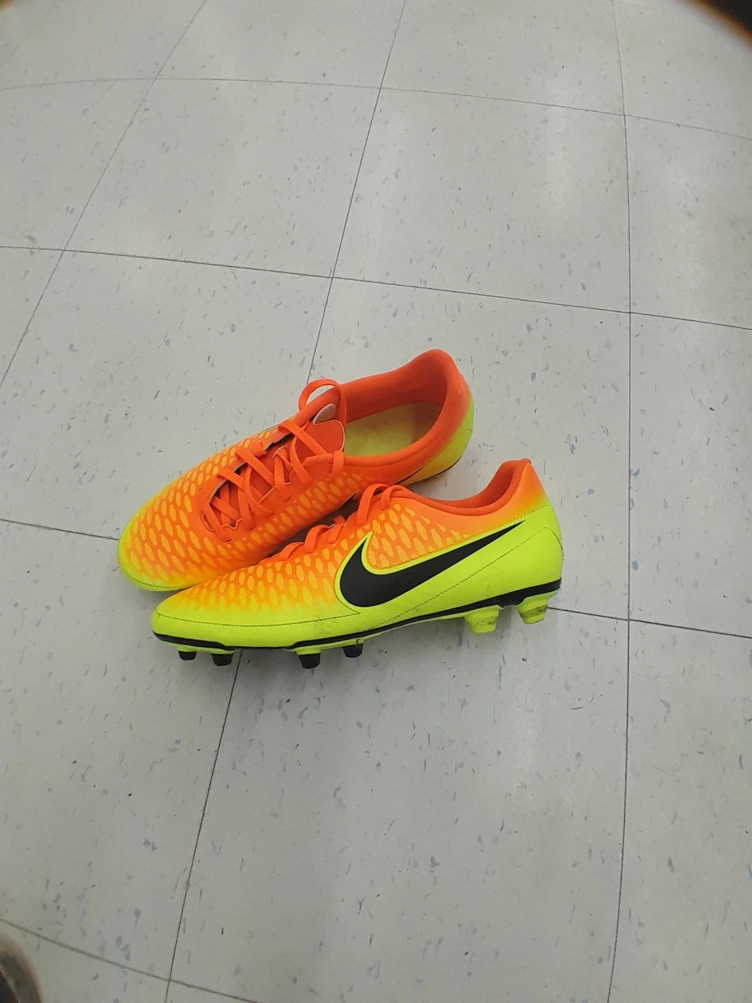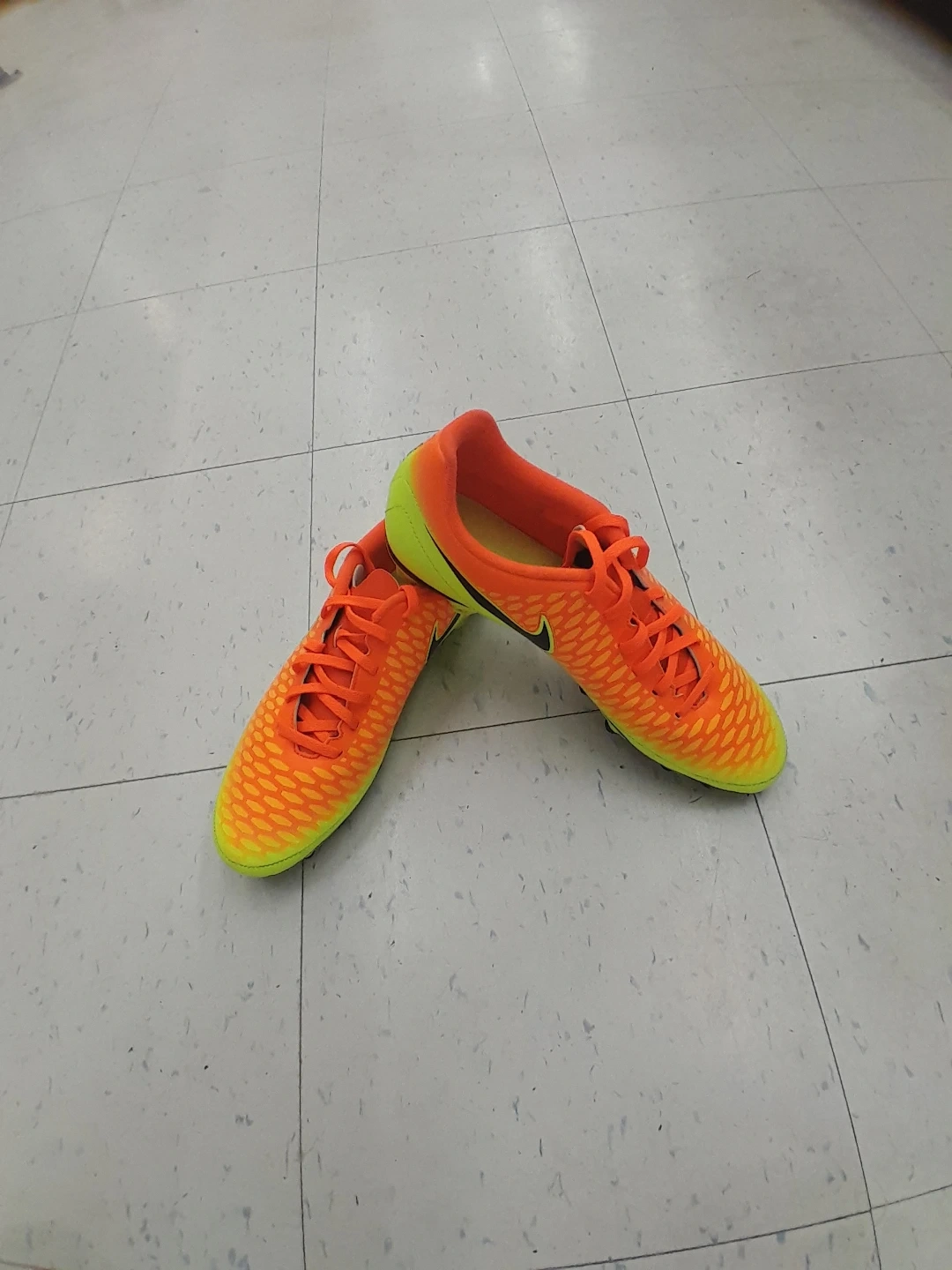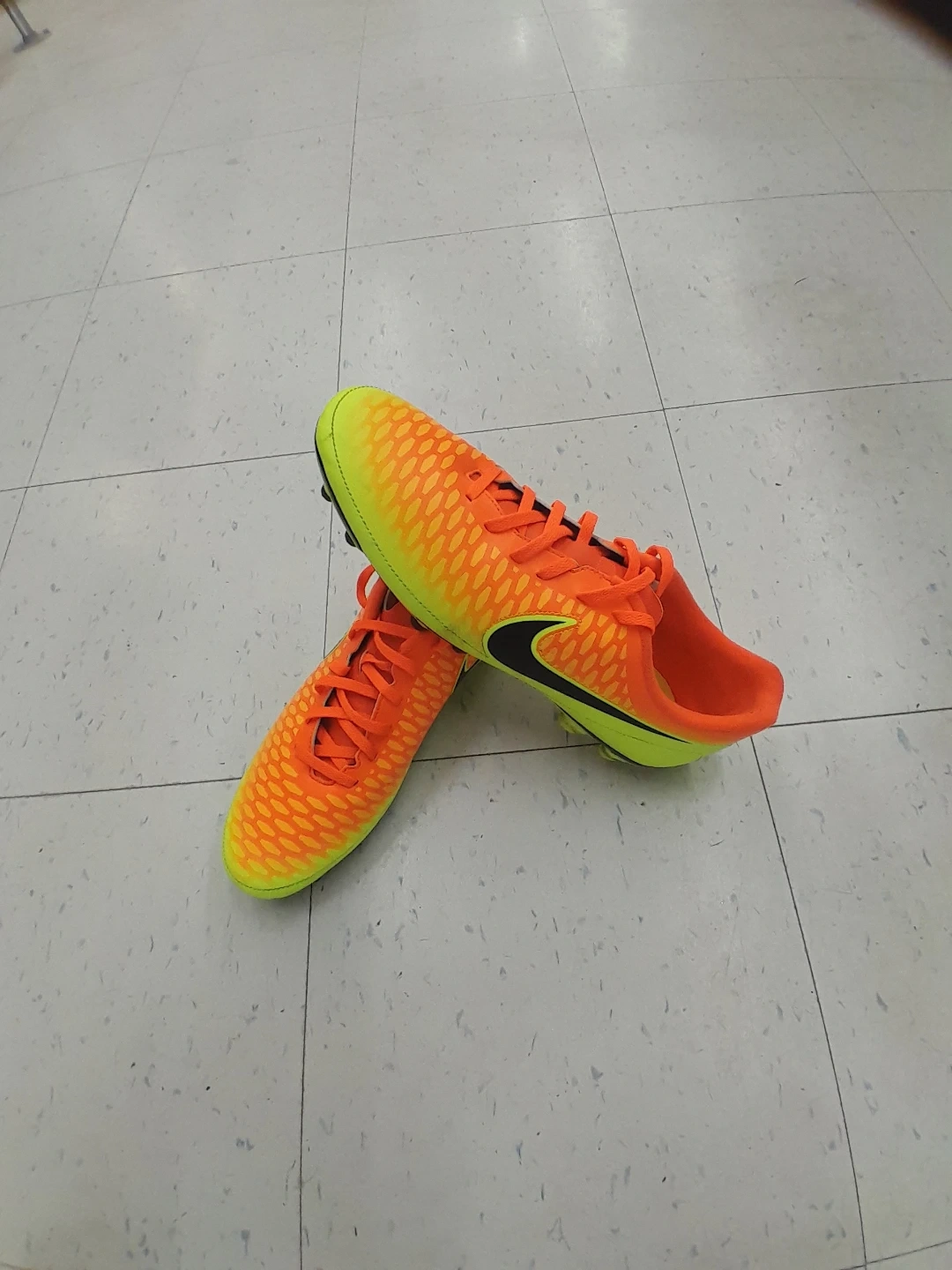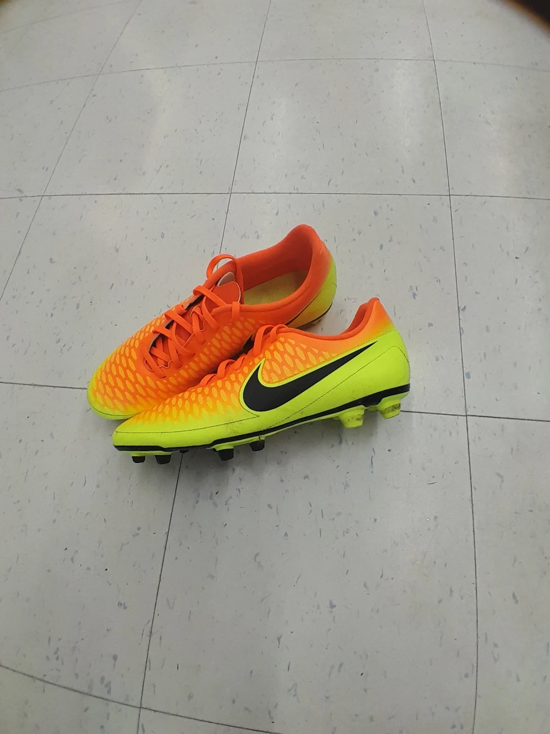 These Nike Mercurial soccer cleats are a vibrant orange and yellow. They're designed for performance on the field. Great for players looking for responsive cleats! Men's size 12.j