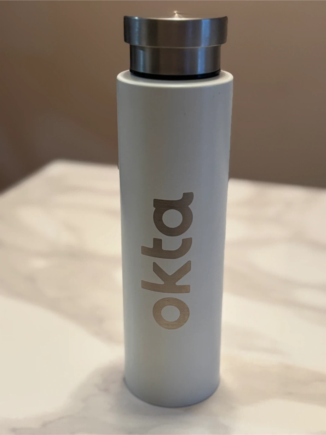 Selling a new white Okta water bottle in great condition! It's perfect for staying hydrated on the go. It's a sleek and stylish bottle that's easy to carry around